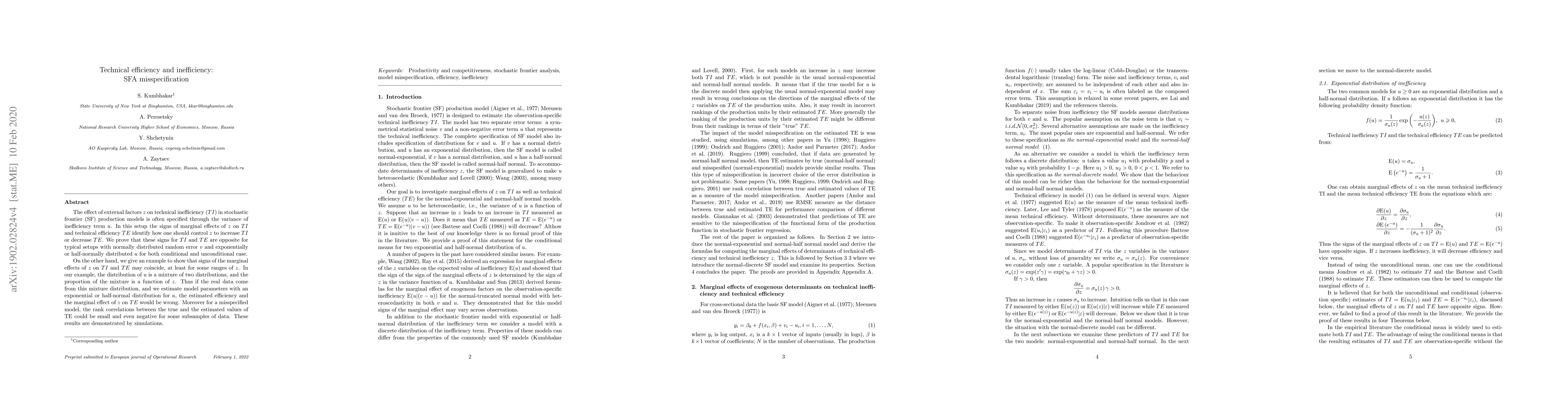 The effect of external factors $z$ on technical inefficiency ($TI$) in stochastic frontier (SF) production models is often specified through the variance of inefficiency term $u$. In this setup the signs of marginal effects of $z$ on $TI$ and technical efficiency $TE$ identify how one should control $z$ to increase $TI$ or decrease $TE$. We prove that these signs for $TI$ and $TE$ are opposite for typical setups with normally distributed random error $v$ and exponentially or half-normally distributed $u$ for both conditional and unconditional cases. On the other hand, we give an example to show that signs of the marginal effects of $z$ on $TI$ and $TE$ may coincide, at least for some ranges of $z$. In our example, the distribution of $u$ is a mixture of two distributions, and the proportion of the mixture is a function of $z$. Thus if the real data comes from this mixture distribution, and we estimate model parameters with an exponential or half-normal distribution for $u$, the estimated efficiency and the marginal effect of $z$ on $TE$ would be wrong. Moreover, for a misspecified model, the rank correlations between the true and the estimated values of TE could be small and even negative for some subsamples of data. These results are demonstrated by simulations.