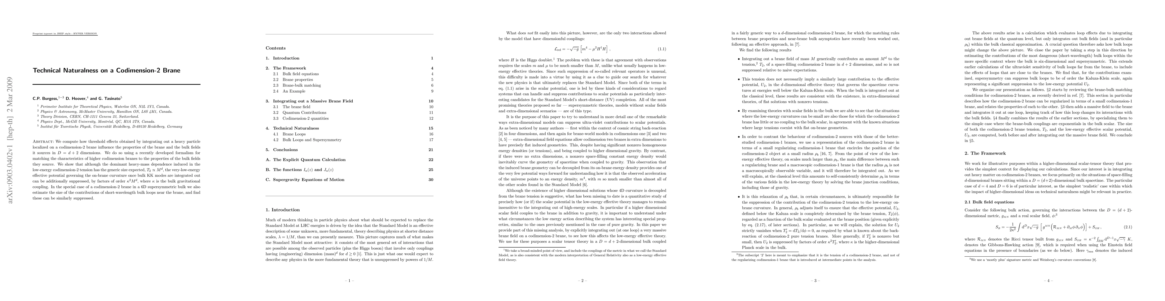 Researchers studied how a heavy particle on a codimension-2 brane affects its properties and bulk fields in higher dimensions. They found that the dominant effect is size-proportional to the heavy mass, but low-energy effects can be suppressed by additional factors.