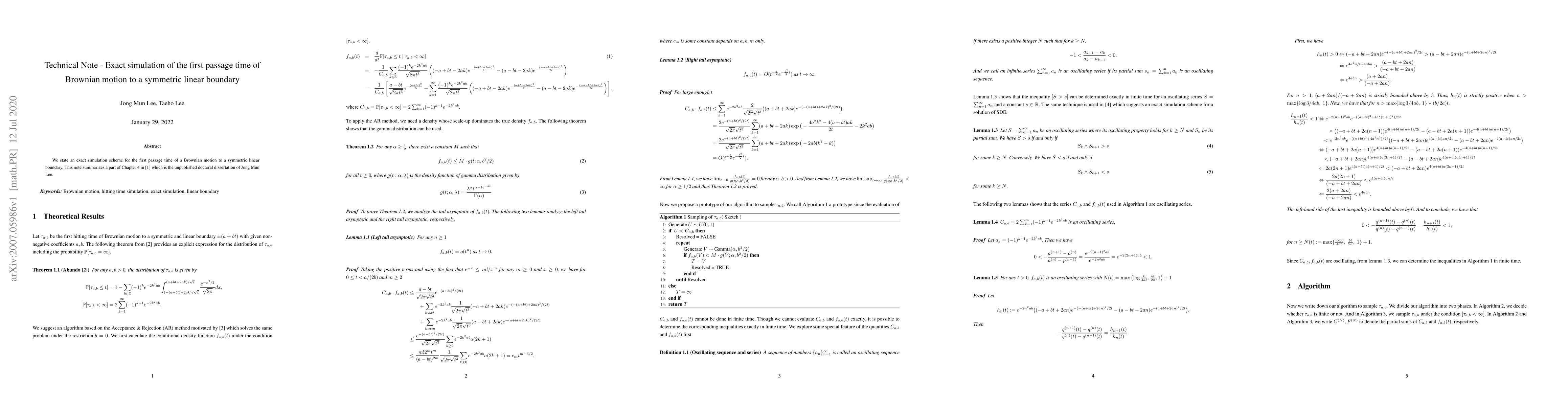 Summary: This paper presents an exact simulation method for determining the first passage time of Brownian motion to a symmetric linear boundary, providing a precise and efficient approach for such stochastic simulations.