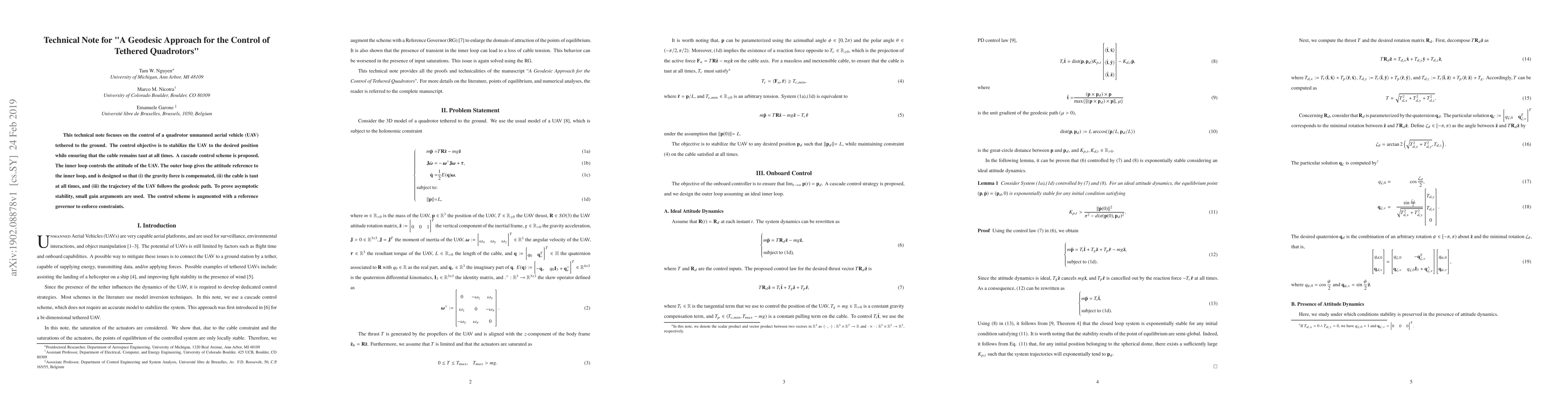 This technical note focuses on the control of a quadrotor unmanned aerial vehicle (UAV) tethered to the ground. The control objective is to stabilize the UAV to the desired position while ensuring that the cable remains taut at all times. A cascade control scheme is proposed. The inner loop controls the attitude of the UAV. The outer loop gives the attitude reference to the inner loop, and is designed so that (i) the gravity force is compensated, (ii) the cable is taut at all times, and (iii) the trajectory of the UAV follows the geodesic path. To prove asymptotic stability, small gain arguments are used. The control scheme is augmented with a reference governor to enforce constraints.
