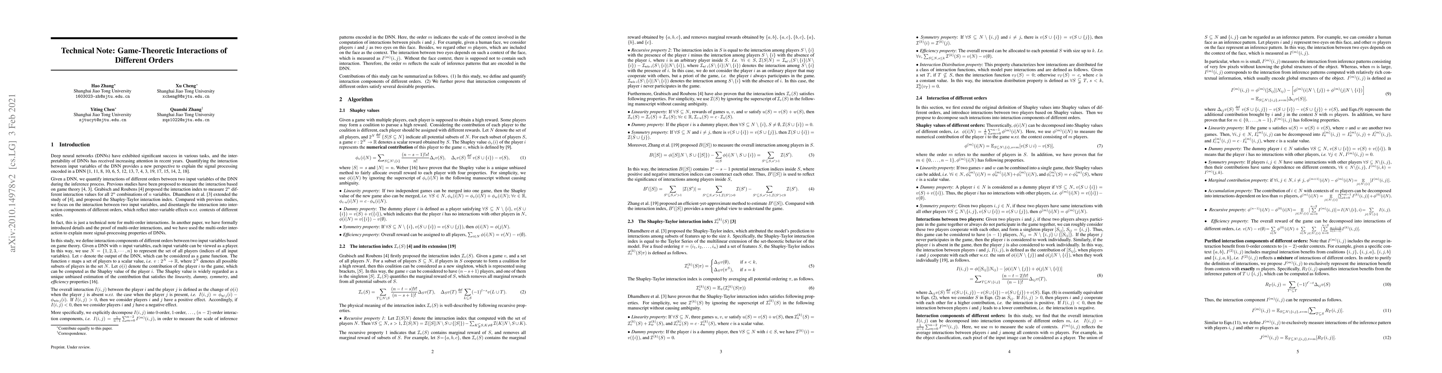 In this study, we define interaction components of different orders between two input variables based on game theory. We further prove that interaction components of different orders satisfy several desirable properties.