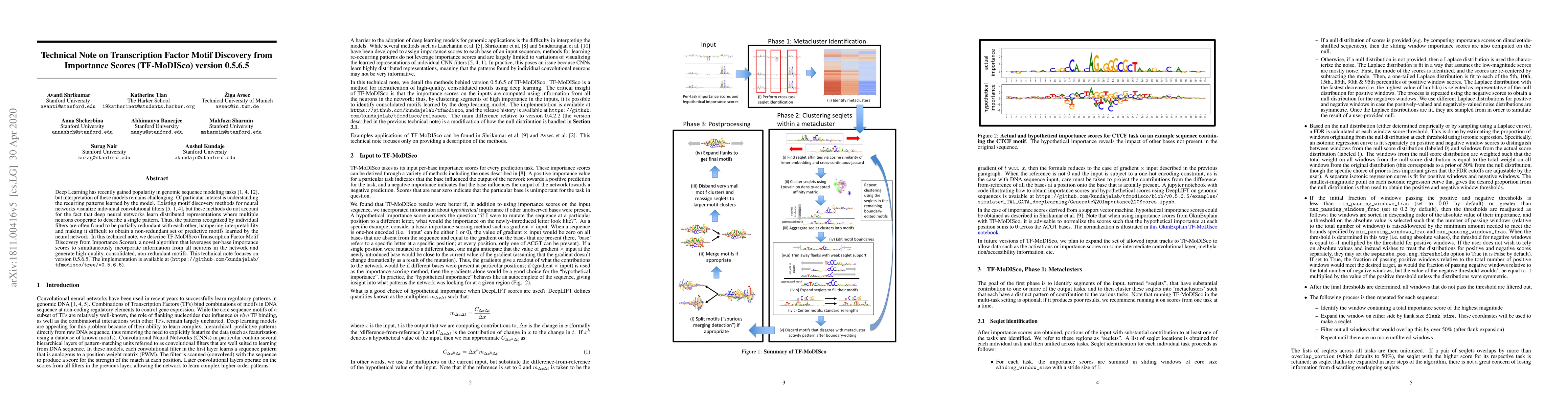 Summary: TF-MoDISco version 0.5.6.5 is an algorithm for discovering transcription factor motifs from basepair-level importance scores in genomic sequences. The updated implementation is available on GitHub.
