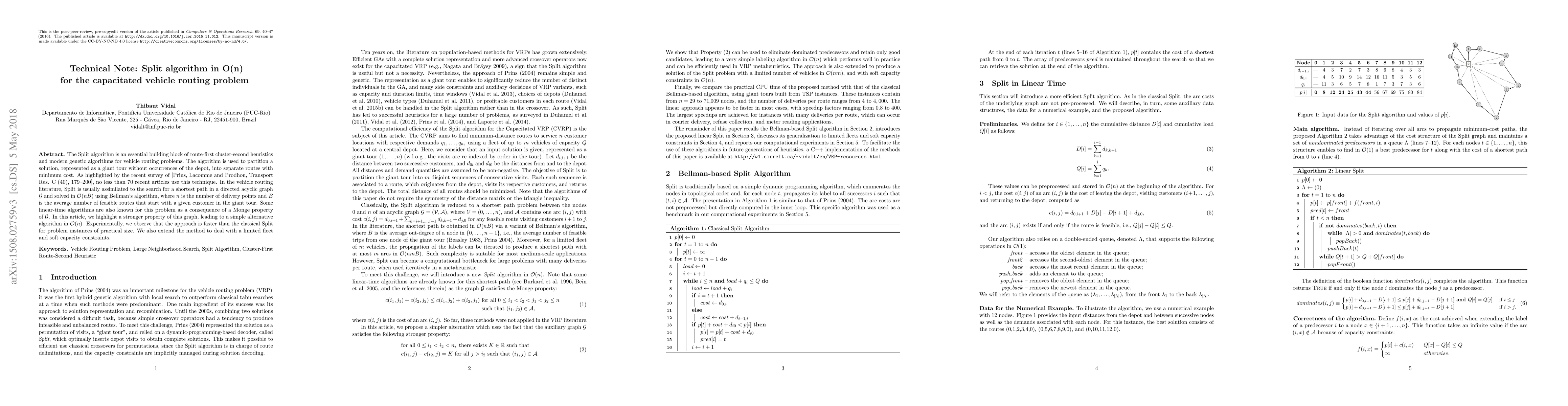 This paper introduces a new O(n) Split algorithm for the Capacitated Vehicle Routing Problem, which partitions a giant tour into separate routes with minimal cost. The proposed method outperforms the traditional O(nB) algorithm and is extended to handle limited fleet and soft capacity constraints.