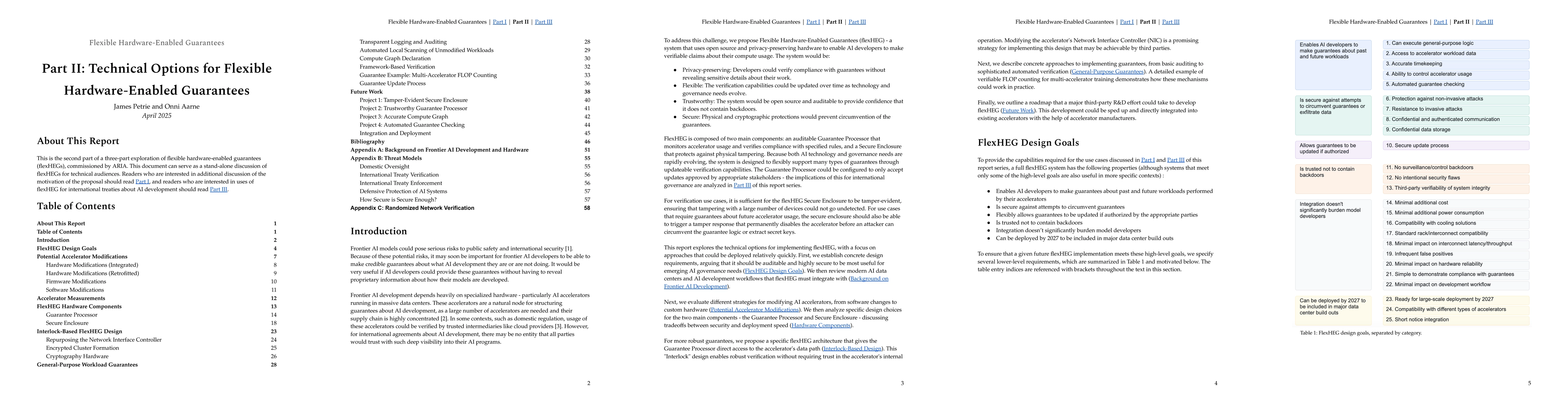 Frontier AI models pose increasing risks to public safety and international security, creating a pressing need for AI developers to provide credible guarantees about their development activities without compromising proprietary information. We propose Flexible Hardware-Enabled Guarantees (flexHEG), a system integrated with AI accelerator hardware to enable verifiable claims about compute usage in AI development. The flexHEG system consists of two primary components: an auditable Guarantee Processor that monitors accelerator usage and verifies compliance with specified rules, and a Secure Enclosure that provides physical tamper protection. In this report, we analyze technical implementation options ranging from firmware modifications to custom hardware approaches, with focus on an "Interlock" design that provides the Guarantee Processor direct access to accelerator data paths. Our proposed architecture could support various guarantee types, from basic usage auditing to sophisticated automated verification. This work establishes technical foundations for hardware-based AI governance mechanisms that could be deployed by 2027 to address emerging regulatory and international security needs in frontier AI development.