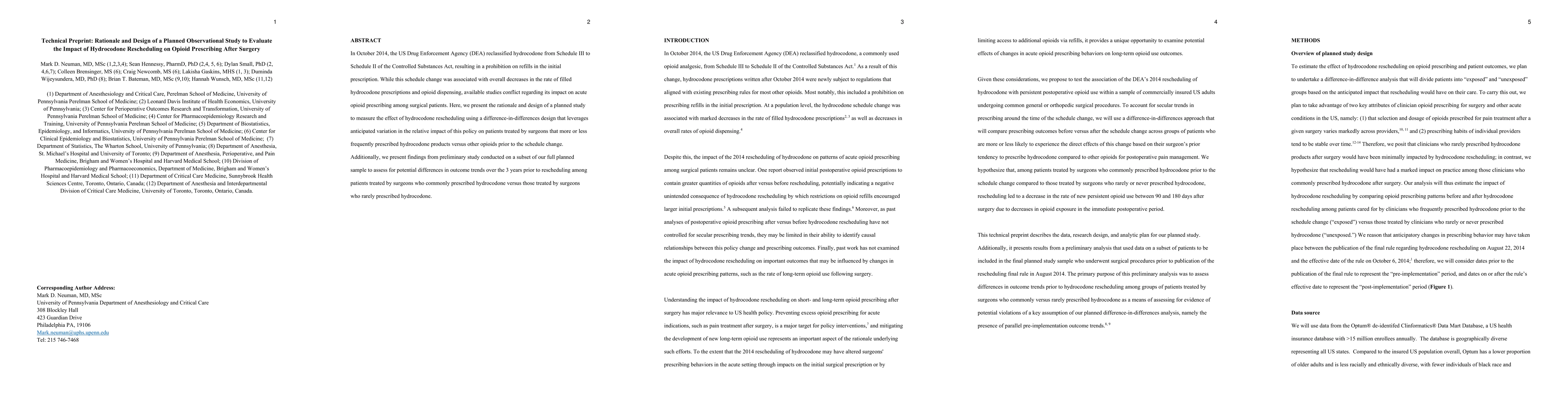 In October 2014, the US Drug Enforcement Agency (DEA) reclassified hydrocodone from Schedule III to Schedule II of the Controlled Substances Act, resulting in a prohibition on refills in the initial prescription. While this schedule change was associated with overall decreases in the rate of filled hydrocodone prescriptions and opioid dispensing, available studies conflict regarding its impact on acute opioid prescribing among surgical patients. Here, we present the rationale and design of a planned study to measure the effect of hydrocodone rescheduling using a difference-in-differences design that leverages anticipated variation in the relative impact of this policy on patients treated by surgeons that more or less frequently prescribed hydrocodone products versus other opioids prior to the schedule change. Additionally, we present findings from preliminary study conducted on a subset of our full planned sample to assess for potential differences in outcome trends over the 3 years prior to rescheduling among patients treated by surgeons who commonly prescribed hydrocodone versus those treated by surgeons who rarely prescribed hydrocodone.