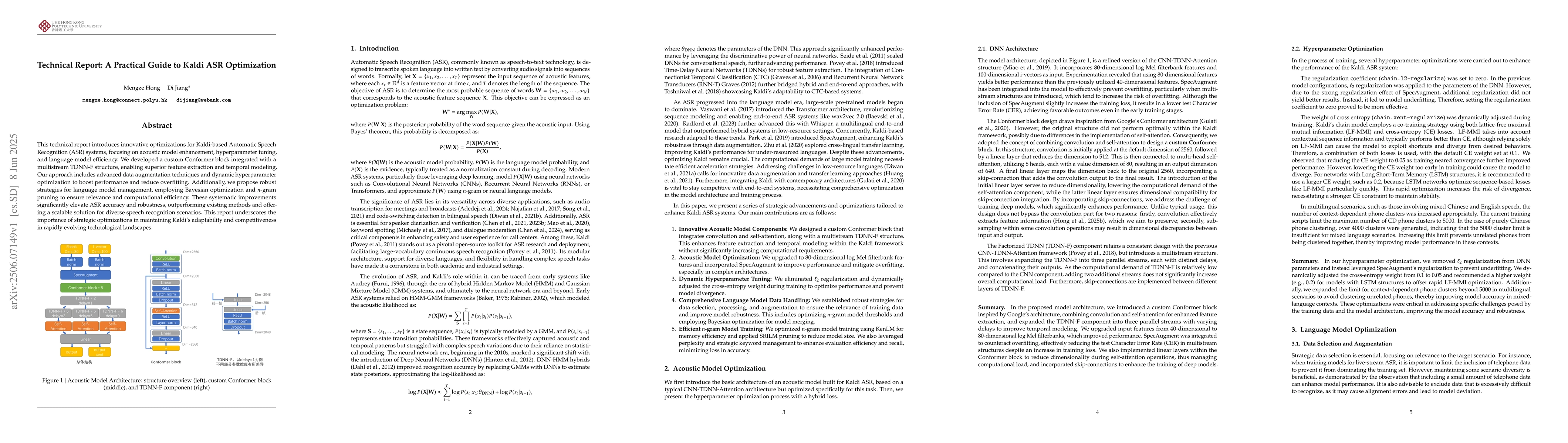 This technical report introduces innovative optimizations for Kaldi-based Automatic Speech Recognition (ASR) systems, focusing on acoustic model enhancement, hyperparameter tuning, and language model efficiency. We developed a custom Conformer block integrated with a multistream TDNN-F structure, enabling superior feature extraction and temporal modeling. Our approach includes advanced data augmentation techniques and dynamic hyperparameter optimization to boost performance and reduce overfitting. Additionally, we propose robust strategies for language model management, employing Bayesian optimization and $n$-gram pruning to ensure relevance and computational efficiency. These systematic improvements significantly elevate ASR accuracy and robustness, outperforming existing methods and offering a scalable solution for diverse speech recognition scenarios. This report underscores the importance of strategic optimizations in maintaining Kaldi's adaptability and competitiveness in rapidly evolving technological landscapes.