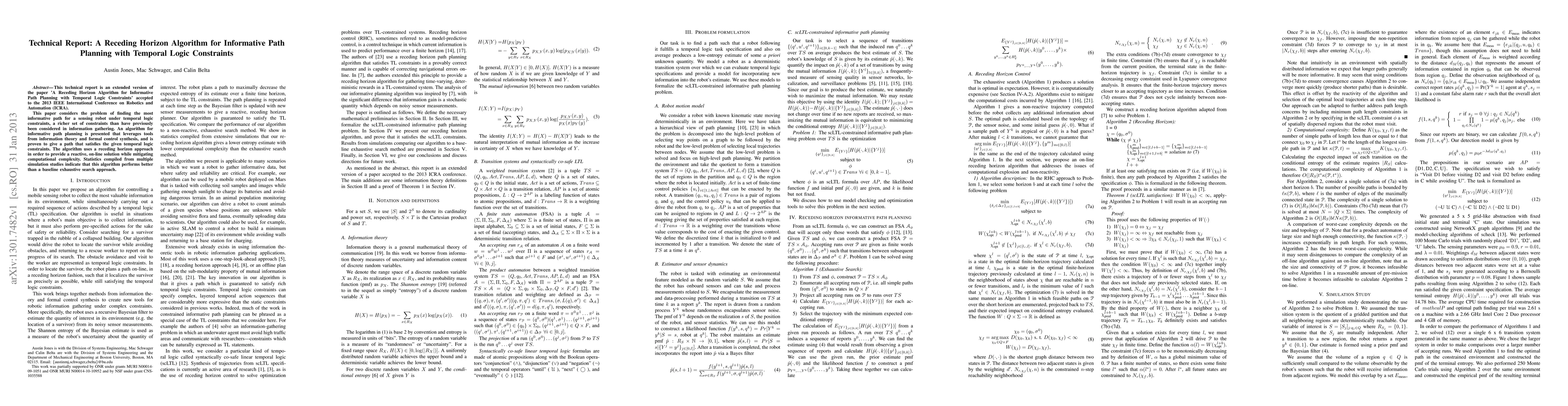 This technical report is an extended version of the paper 'A Receding Horizon Algorithm for Informative Path Planning with Temporal Logic Constraints' accepted to the 2013 IEEE International Conference on Robotics and Automation (ICRA). This paper considers the problem of finding the most informative path for a sensing robot under temporal logic constraints, a richer set of constraints than have previously been considered in information gathering. An algorithm for informative path planning is presented that leverages tools from information theory and formal control synthesis, and is proven to give a path that satisfies the given temporal logic constraints. The algorithm uses a receding horizon approach in order to provide a reactive, on-line solution while mitigating computational complexity. Statistics compiled from multiple simulation studies indicate that this algorithm performs better than a baseline exhaustive search approach.
