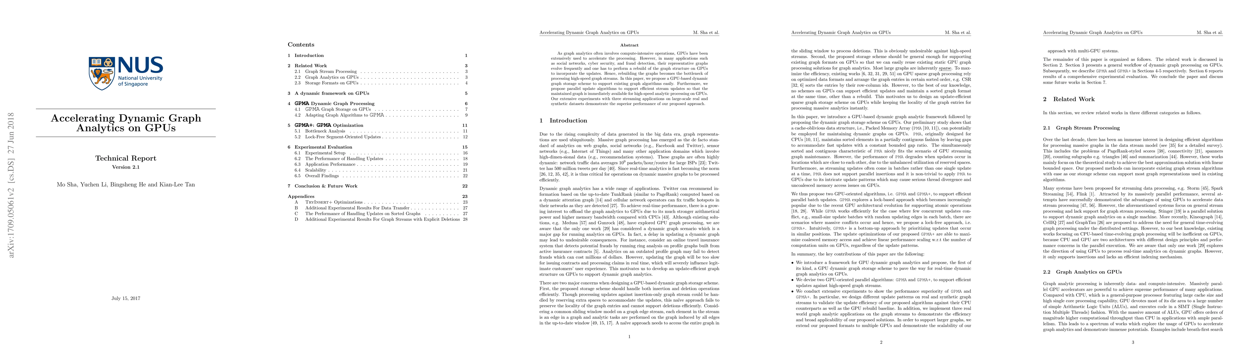 This paper proposes a GPU-based dynamic graph storage scheme and parallel update algorithms to efficiently handle frequent graph updates, addressing the bottleneck of rebuilding graphs for high-speed analytics. Experiments show significant performance improvements for streaming applications on large datasets.