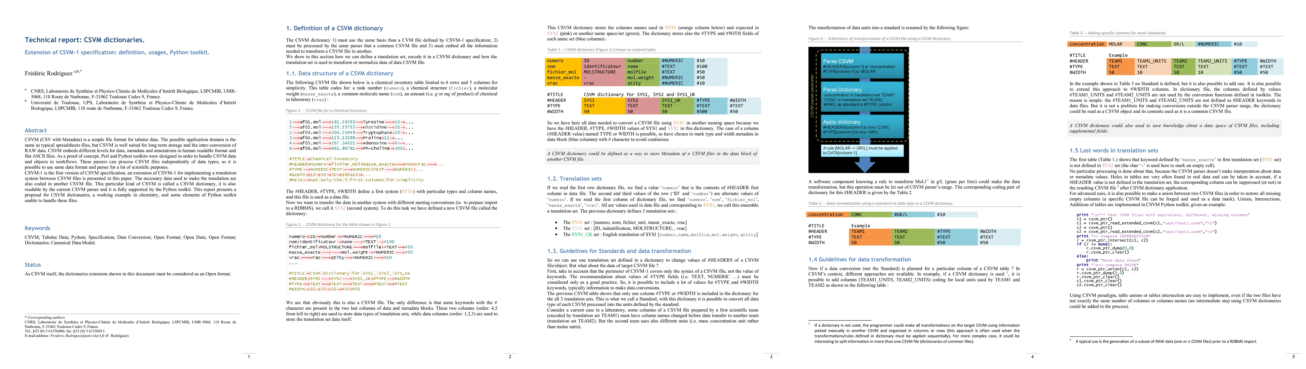 CSVM (CSV with Metadata) is a simple file format for tabular data. The possible application domain is the same as typical spreadsheets files, but CSVM is well suited for long term storage and the inter-conversion of RAW data. CSVM embeds different levels for data, metadata and annotations in human readable format and flat ASCII files. As a proof of concept, Perl and Python toolkits were designed in order to handle CSVM data and objects in workflows. These parsers can process CSVM files independently of data types, so it is possible to use same data format and parser for a lot of scientific purposes. CSVM-1 is the first version of CSVM specification, an extension of CSVM-1 for implementing a translation system between CSVM files is presented in this paper. The necessary data used to make the translation are also coded in another CSVM file. This particular kind of CSVM is called a CSVM dictionary, it is also readable by the current CSVM parser and it is fully supported by the Python toolkit. This report presents a proposal for CSVM dictionaries, a working example in chemistry, and some elements of Python toolkit usable to handle these files.