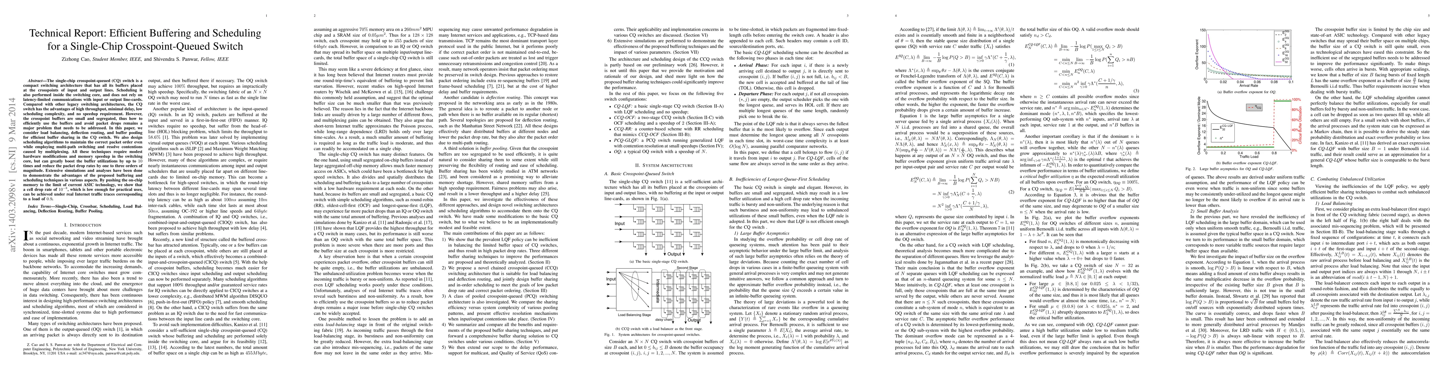 This paper presents techniques for efficient buffering and scheduling in a single-chip crosspoint-queued (CQ) switch, addressing the challenge of small, segregated crosspoint buffers. Proposed methods include load balancing, deflection routing, and buffer pooling, along with scheduling algorithms to maintain packet order and resolve contentions, achieving up to 10 times higher buffer utilization and significantly lower packet drop rates.
