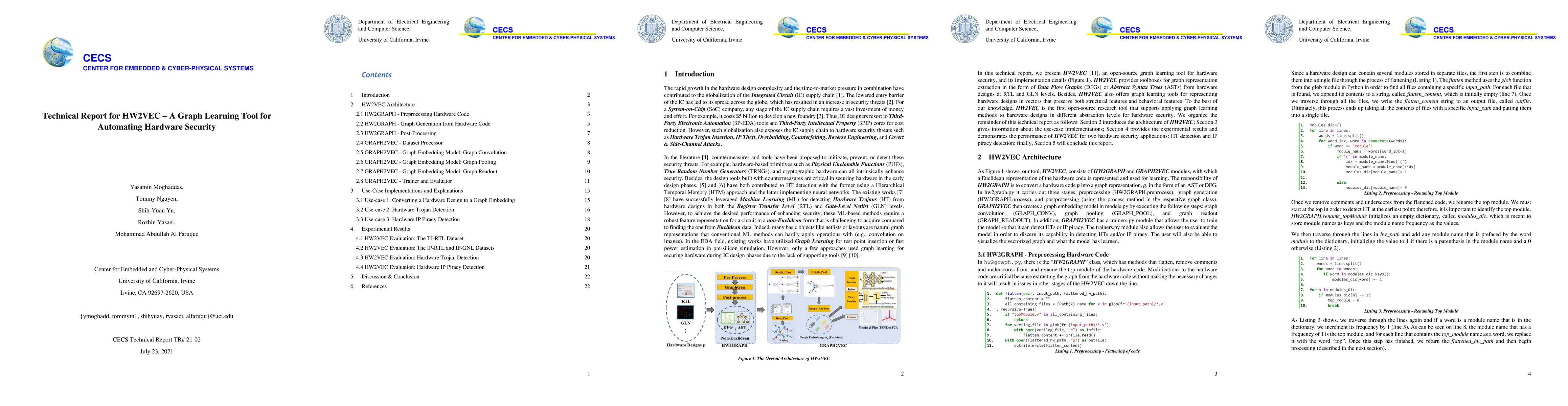 In this technical report, we present HW2VEC [11], an open-source graph learning tool for hardware security, and its implementation details (Figure 1). HW2VEC provides toolboxes for graph representation extraction in the form of Data Flow Graphs (DFGs) or Abstract Syntax Trees (ASTs) from hardware designs at RTL and GLN levels. Besides, HW2VEC also offers graph learning tools for representing hardware designs in vectors that preserve both structural features and behavioral features. To the best of our knowledge, HW2VEC is the first open-source research tool that supports applying graph learning methods to hardware designs in different abstraction levels for hardware security. We organize the remainder of this technical report as follows: Section 2 introduces the architecture of HW2VEC; Section 3 gives information about the use-case implementations; Section 4 provides the experimental results and demonstrates the performance of HW2VEC for two hardware security applications: HT detection and IP piracy detection; finally, Section 5 will conclude this report.