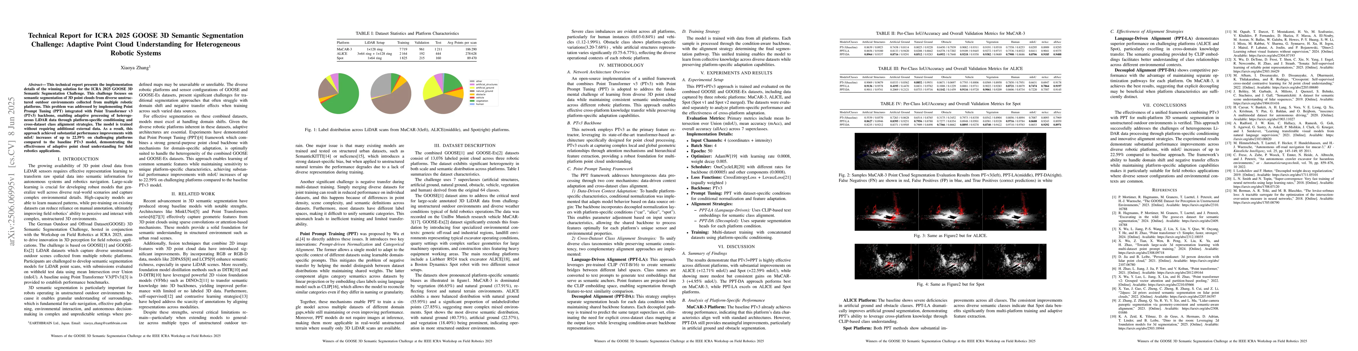 This technical report presents the implementation details of the winning solution for the ICRA 2025 GOOSE 3D Semantic Segmentation Challenge. This challenge focuses on semantic segmentation of 3D point clouds from diverse unstructured outdoor environments collected from multiple robotic platforms. This problem was addressed by implementing Point Prompt Tuning (PPT) integrated with Point Transformer v3 (PTv3) backbone, enabling adaptive processing of heterogeneous LiDAR data through platform-specific conditioning and cross-dataset class alignment strategies. The model is trained without requiring additional external data. As a result, this approach achieved substantial performance improvements with mIoU increases of up to 22.59% on challenging platforms compared to the baseline PTv3 model, demonstrating the effectiveness of adaptive point cloud understanding for field robotics applications.