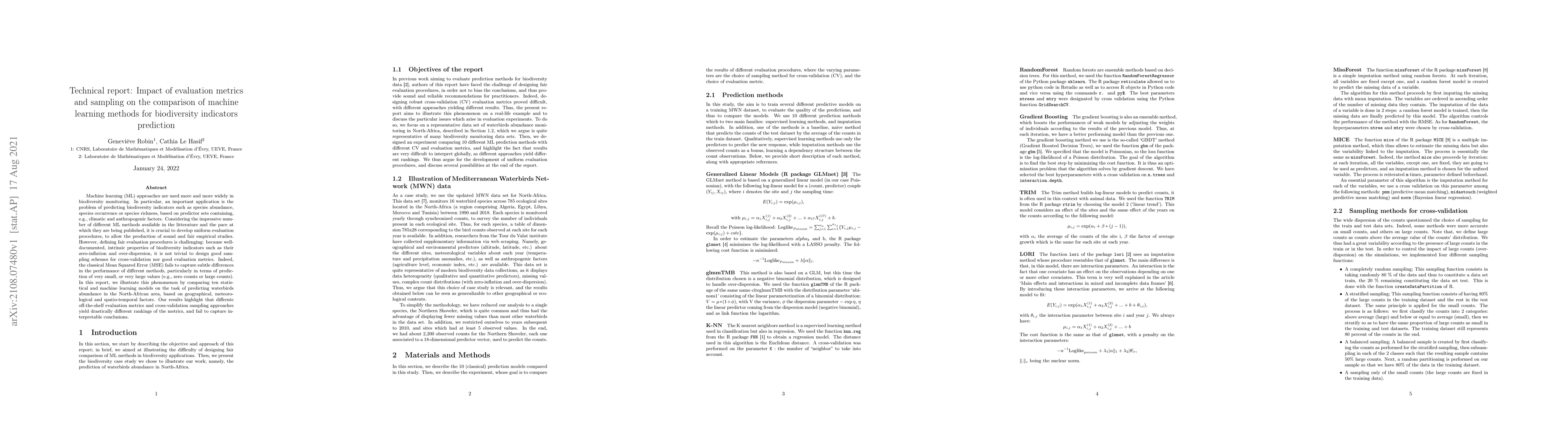Machine learning (ML) approaches are used more and more widely in biodiversity monitoring. In particular, an important application is the problem of predicting biodiversity indicators such as species abundance, species occurrence or species richness, based on predictor sets containing, e.g., climatic and anthropogenic factors. Considering the impressive number of different ML methods available in the litterature and the pace at which they are being published, it is crucial to develop uniform evaluation procedures, to allow the production of sound and fair empirical studies. However, defining fair evaluation procedures is challenging: because well-documented, intrinsic properties of biodiversity indicators such as their zero-inflation and over-dispersion, it is not trivial to design good sampling schemes for cross-validation nor good evaluation metrics. Indeed, the classical Mean Squared Error (MSE) fails to capture subtle differences in the performance of different methods, particularly in terms of prediction of very small, or very large values (e.g., zero counts or large counts). In this report, we illustrate this phenomenon by comparing ten statistical and machine learning models on the task of predicting waterbirds abundance in the North-African area, based on geographical, meteorological and spatio-temporal factors. Our results highlight that differnte off-the-shelf evaluation metrics and cross-validation sampling approaches yield drastically different rankings of the metrics, and fail to capture interpretable conclusions.