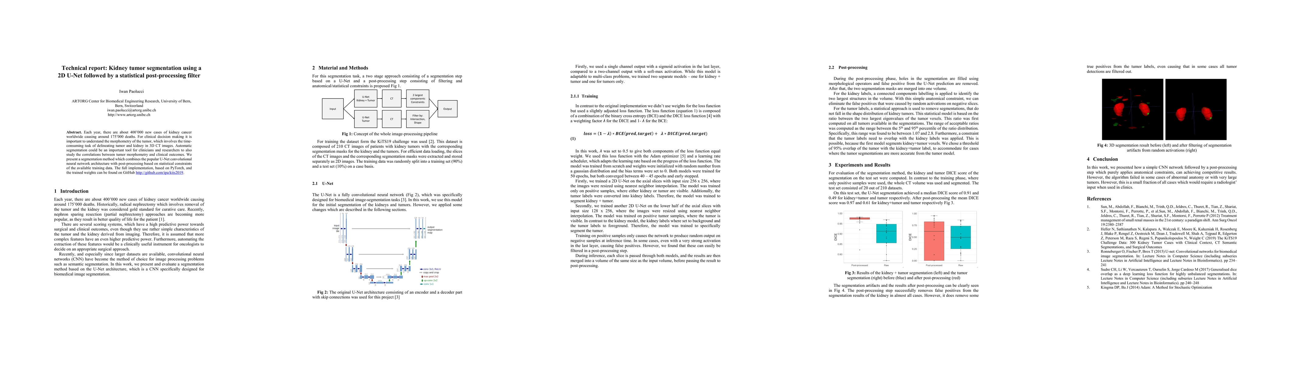 This paper proposes a method for kidney tumor segmentation using a 2D U-Net followed by a statistical post-processing filter to improve accuracy. The approach aims to automate the delineation of tumors in 3D CT images, aiding in clinical decision-making and research on tumor morphometry.