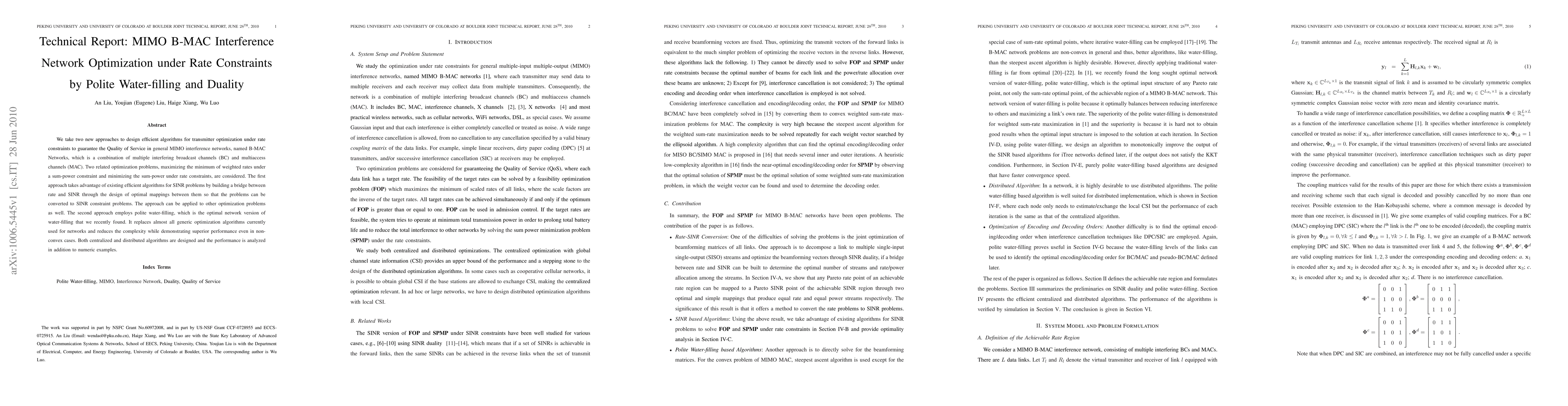 This paper presents two novel algorithms for optimizing transmitters in MIMO B-MAC interference networks under rate constraints. The first leverages optimal mappings between rate and SINR constraints, while the second utilizes polite water-filling to reduce complexity and improve performance. Both centralized and distributed algorithms are developed and evaluated.