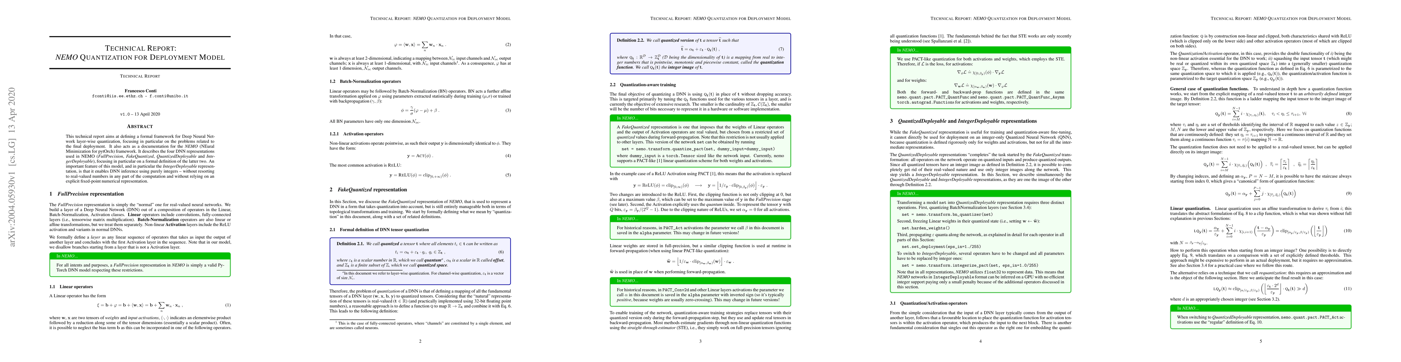 This technical report aims at defining a formal framework for Deep Neural Network (DNN) layer-wise quantization, focusing in particular on the problems related to the final deployment. It also acts as a documentation for the NEMO (NEural Minimization for pytOrch) framework. It describes the four DNN representations used in NEMO (FullPrecision, FakeQuantized, QuantizedDeployable and IntegerDeployable), focusing in particular on a formal definition of the latter two. An important feature of this model, and in particular the IntegerDeployable representation, is that it enables DNN inference using purely integers - without resorting to real-valued numbers in any part of the computation and without relying on an explicit fixed-point numerical representation.