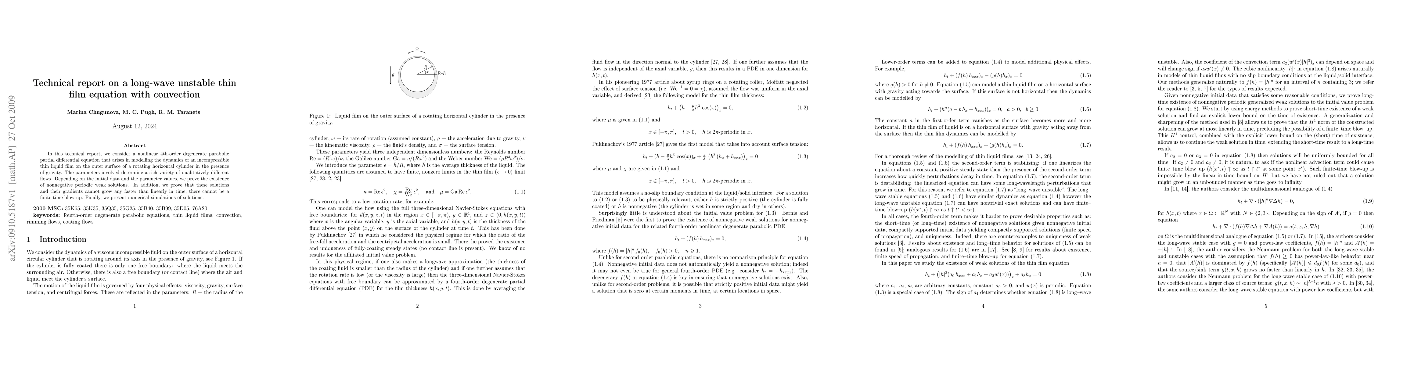 In this technical report, we consider a nonlinear 4th-order degenerate parabolic partial differential equation that arises in modelling the dynamics of an incompressible thin liquid film on the outer surface of a rotating horizontal cylinder in the presence of gravity. The parameters involved determine a rich variety of qualitatively different flows. Depending on the initial data and the parameter values, we prove the existence of nonnegative periodic weak solutions. In addition, we prove that these solutions and their gradients cannot grow any faster than linearly in time; there cannot be a finite-time blow-up. Finally, we present numerical simulations of solutions.