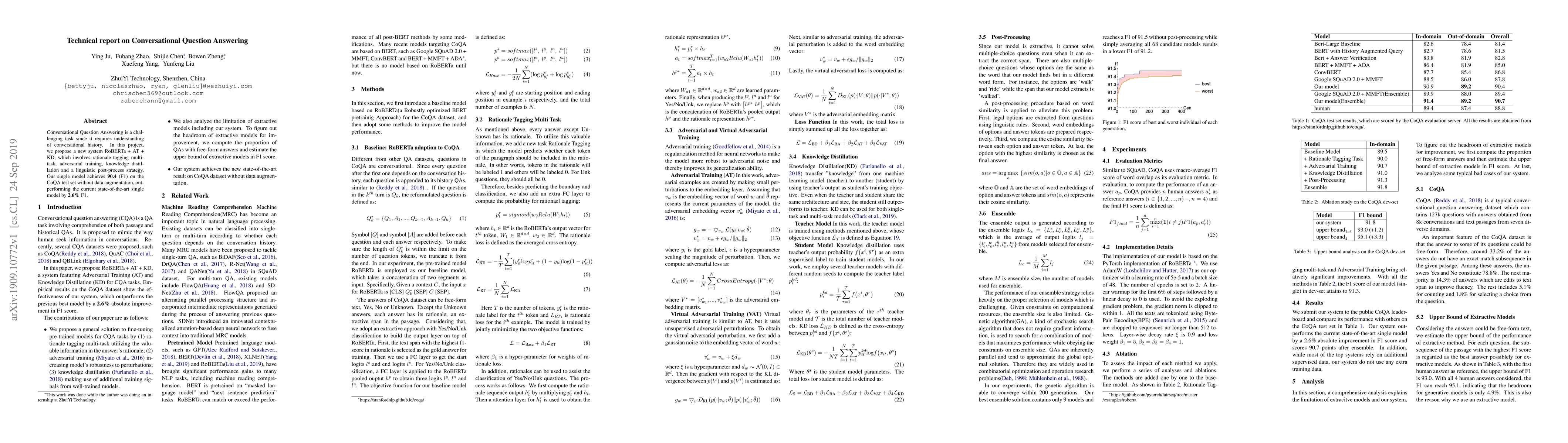 This report introduces a new system called RoBERTa + AT + KD for Conversational Question Answering, combining rationale tagging, adversarial training, knowledge distillation, and linguistic post-processing. The model achieves a 90.4 F1 score on the CoQA test set, outperforming the previous state-of-the-art by 2.6% F1 without data augmentation.