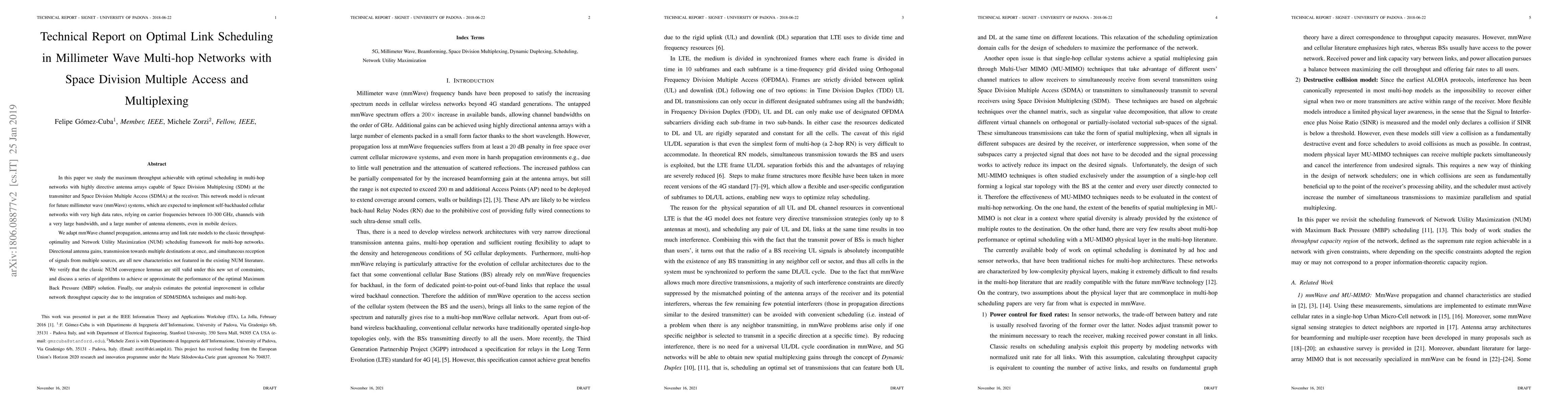 This paper investigates optimal scheduling for maximizing throughput in multi-hop millimeter wave networks using Space Division Multiplexing and Access at high carrier frequencies. It adapts existing scheduling frameworks to account for new characteristics like directional antennas and multi-destination transmissions, and proposes algorithms to approximate optimal performance.