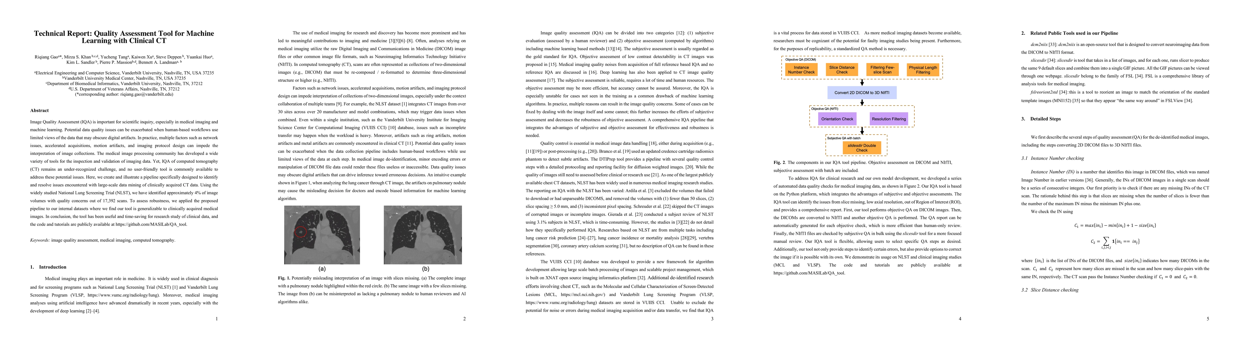 Image Quality Assessment (IQA) is important for scientific inquiry, especially in medical imaging and machine learning. Potential data quality issues can be exacerbated when human-based workflows use limited views of the data that may obscure digital artifacts. In practice, multiple factors such as network issues, accelerated acquisitions, motion artifacts, and imaging protocol design can impede the interpretation of image collections. The medical image processing community has developed a wide variety of tools for the inspection and validation of imaging data. Yet, IQA of computed tomography (CT) remains an under-recognized challenge, and no user-friendly tool is commonly available to address these potential issues. Here, we create and illustrate a pipeline specifically designed to identify and resolve issues encountered with large-scale data mining of clinically acquired CT data. Using the widely studied National Lung Screening Trial (NLST), we have identified approximately 4% of image volumes with quality concerns out of 17,392 scans. To assess robustness, we applied the proposed pipeline to our internal datasets where we find our tool is generalizable to clinically acquired medical images. In conclusion, the tool has been useful and time-saving for research study of clinical data, and the code and tutorials are publicly available at https://github.com/MASILab/QA_tool.