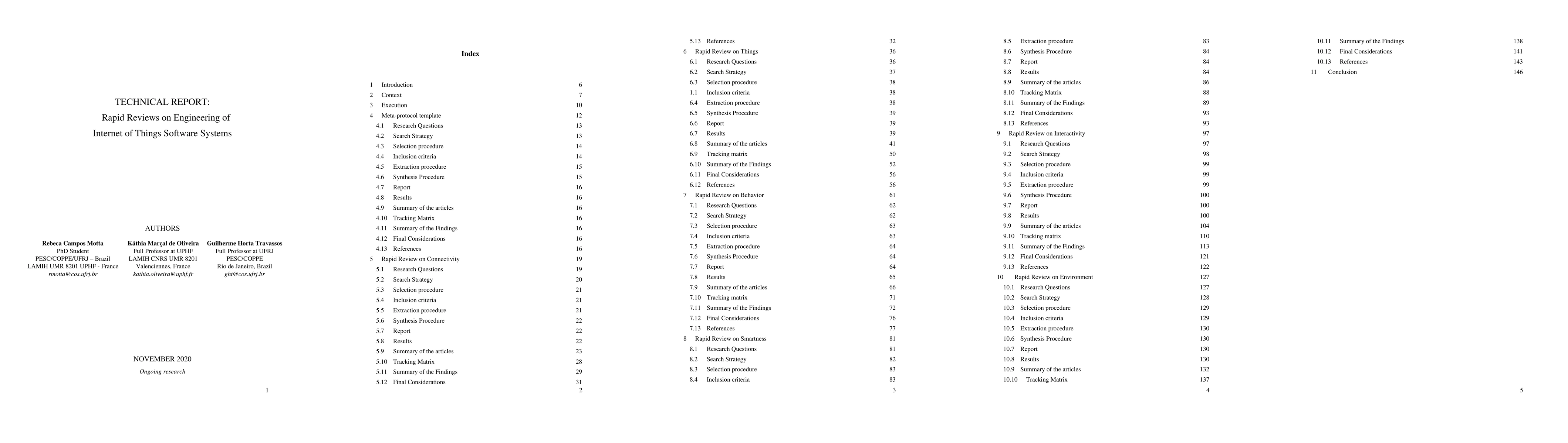 This report presents Rapid Reviews on six facets of Internet of Things (IoT) software systems, including Connectivity, Things, Behavior, Smartness, Interactivity, and Environment, with a focus on Security. A detailed meta-protocol was developed and applied to each facet, providing insights into the challenges and characteristics of IoT systems.