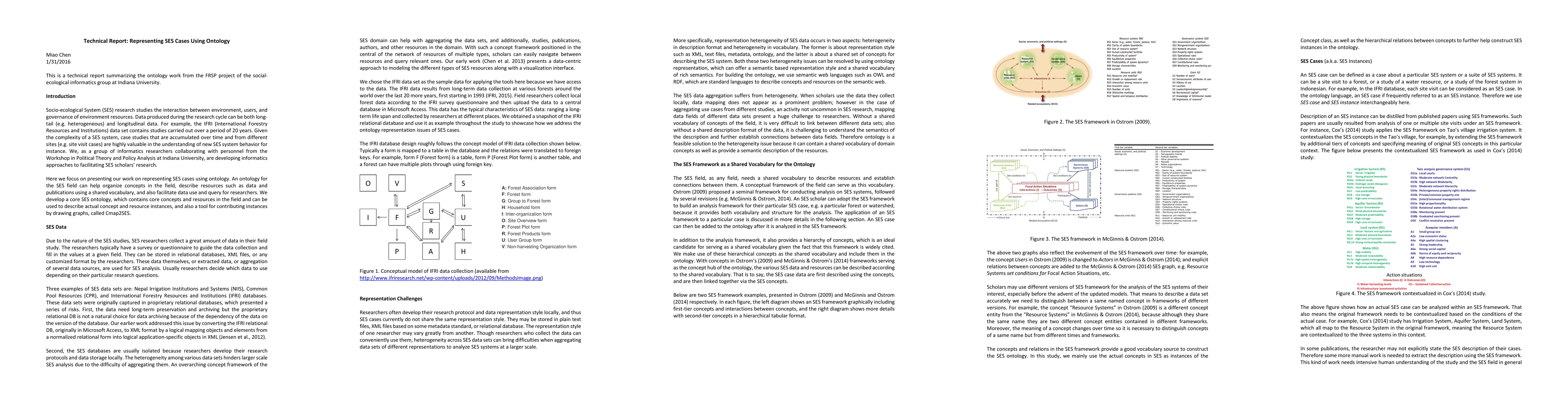Socio-ecological System (SES) research studies the interaction between environment, users, and governance of environment resources. Data produced during the research cycle can be both long-tail (e.g. heterogeneous) and longitudinal data. For example, the IFRI (International Forestry Resources and Institutions) data set contains studies carried out over a period of 20 years. Given the complexity of a SES system, case studies that are accumulated over time and from different sites (e.g. site visit cases) are highly valuable in the understanding of new SES system behavior for instance. We, as a group of informatics researchers collaborating with personnel from the Workshop in Political Theory and Policy Analysis at Indiana University, are developing informatics approaches to facilitating SES scholars' research. Here we focus on presenting our work on representing SES cases using ontology. An ontology for the SES field can help organize concepts in the field, describe resources such as data and publications using a shared vocabulary, and also facilitate data use and query for researchers. We develop a core SES ontology, which contains core concepts and resources in the field and can be used to describe actual concept and resource instances, and also a tool for contributing instances by drawing graphs, called Cmap2SES.