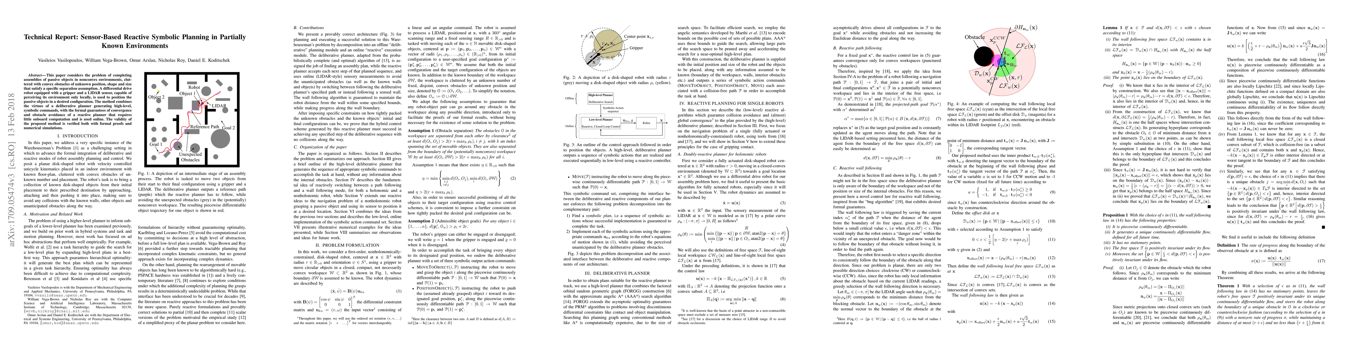 This paper considers the problem of completing assemblies of passive objects in nonconvex environments, cluttered with convex obstacles of unknown position, shape and size that satisfy a specific separation assumption. A differential drive robot equipped with a gripper and a LIDAR sensor, capable of perceiving its environment only locally, is used to position the passive objects in a desired configuration. The method combines the virtues of a deliberative planner generating high-level, symbolic commands, with the formal guarantees of convergence and obstacle avoidance of a reactive planner that requires little onboard computation and is used online. The validity of the proposed method is verified both with formal proofs and numerical simulations.