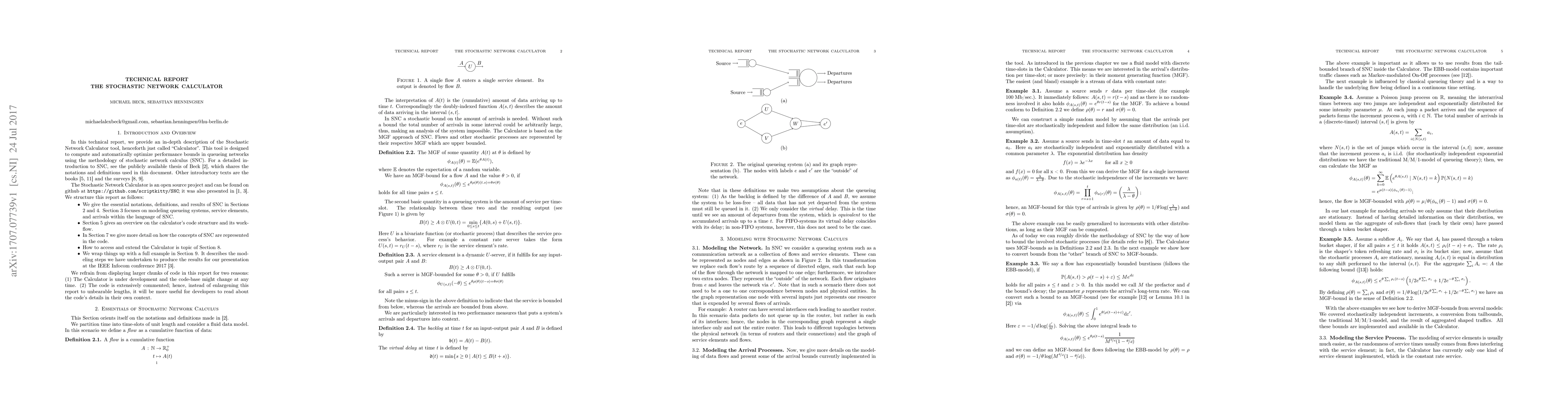 In this technical report, we provide an in-depth description of the Stochastic Network Calculator tool. This tool is designed to compute and automatically optimize performance bounds in queueing networks using the methodology of stochastic network calculus.