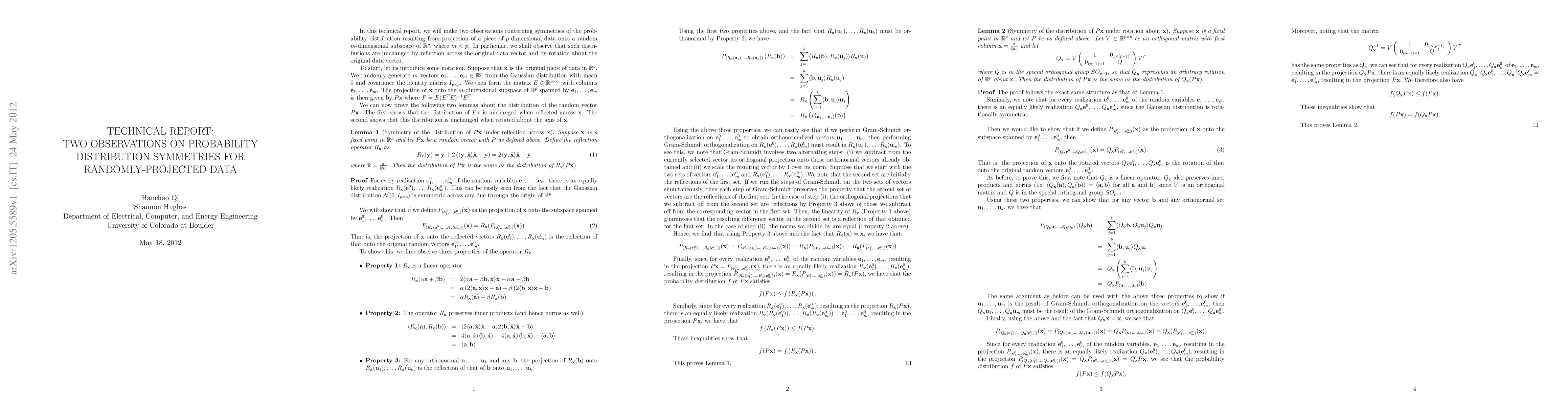 This technical report observes two symmetries in the probability distribution of data projected from p-dimensions to an m-dimensional random subspace of u211d^p (where m < p). The distribution remains invariant under reflection through the original data vector and rotation around it.