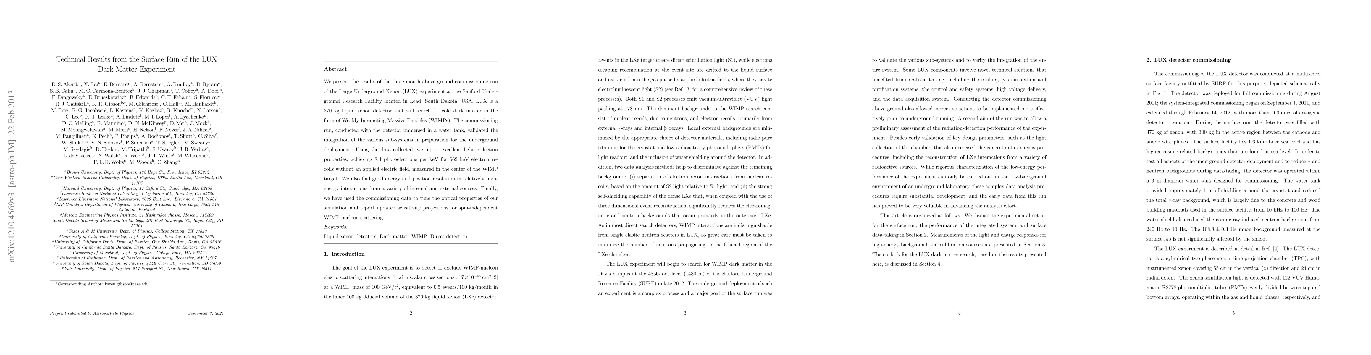 The LUX experiment's three-month above-ground commissioning run demonstrated excellent light collection and energy resolution, achieving 8.4 photoelectrons per keV, and validated the detector's subsystems for future underground deployment to search for WIMPs. Updated sensitivity projections for WIMP-nucleon interactions were also reported based on the commissioning data.