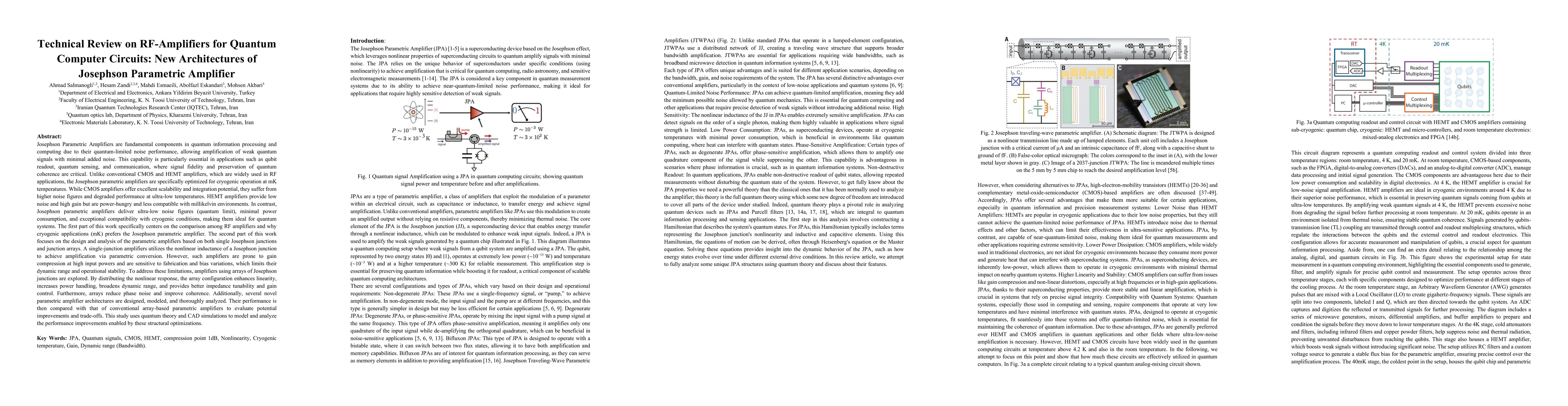 Josephson Parametric Amplifiers (JPAs) are key components in quantum information processing due to their ability to amplify weak quantum signals with near-quantum-limited noise performance. This is essential for applications such as qubit readout, quantum sensing, and communication, where signal fidelity and coherence preservation are critical. Unlike CMOS and HEMT amplifiers used in conventional RF systems, JPAs are specifically optimized for millikelvin (mK) cryogenic environments. CMOS amplifiers offer good integration but perform poorly at ultra-low temperatures due to high noise. HEMT amplifiers provide better noise performance but are power-intensive and less suited for mK operation. JPAs, by contrast, combine low power consumption with ultra-low noise and excellent cryogenic compatibility, making them ideal for quantum systems. The first part of this study compares these RF amplifier types and explains why JPAs are preferred in cryogenic quantum applications. The second part focuses on the design and analysis of JPAs based on both single Josephson junctions and junction arrays. While single-junction JPAs utilize nonlinear inductance for amplification, they suffer from gain compression, limited dynamic range, and sensitivity to fabrication variations. To overcome these challenges, this work explores JPA designs using Josephson junction arrays. Arrays distribute the nonlinear response, enhancing power handling, linearity, impedance tunability, and coherence while reducing phase noise. Several advanced JPA architectures are proposed, simulated, and compared using quantum theory and CAD tools to assess performance trade-offs and improvements over conventional designs.