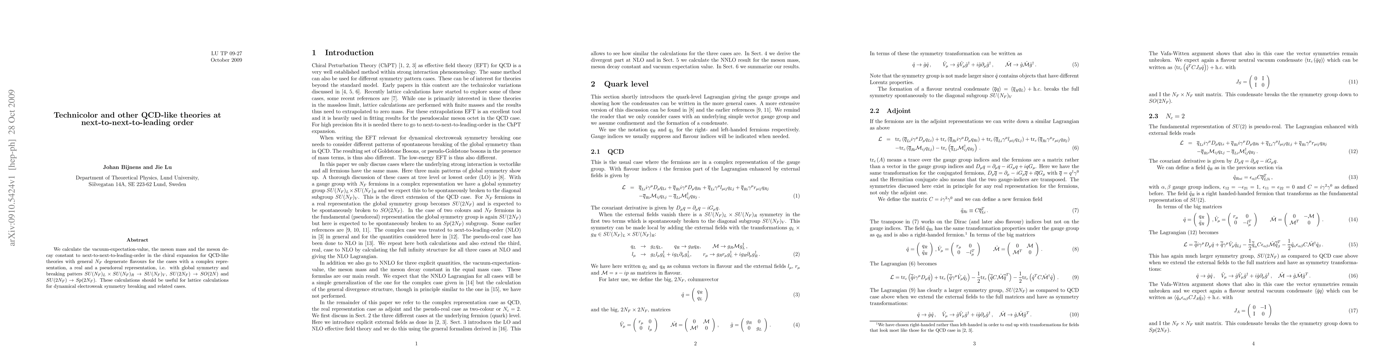 We calculate the vacuum-expectation-value, the meson mass and the meson decay constant to next-to-next-to-leading-order in the chiral expansion for QCD-like theories with general $N_F$ degenerate flavours for the cases with a complex representation, a real and a pseudoreal representation, i.e. with global symmetry and breaking patters $SU(N_F)_L\times SU(N_F)_R\to SU(N_F)_V$, $SU(2N_F)\to SO(2N)$ and $SU(2N_F)\to Sp(2N_F)$. These calculations should be useful for lattice calculations for dynamical electroweak symmetry breaking and related cases.