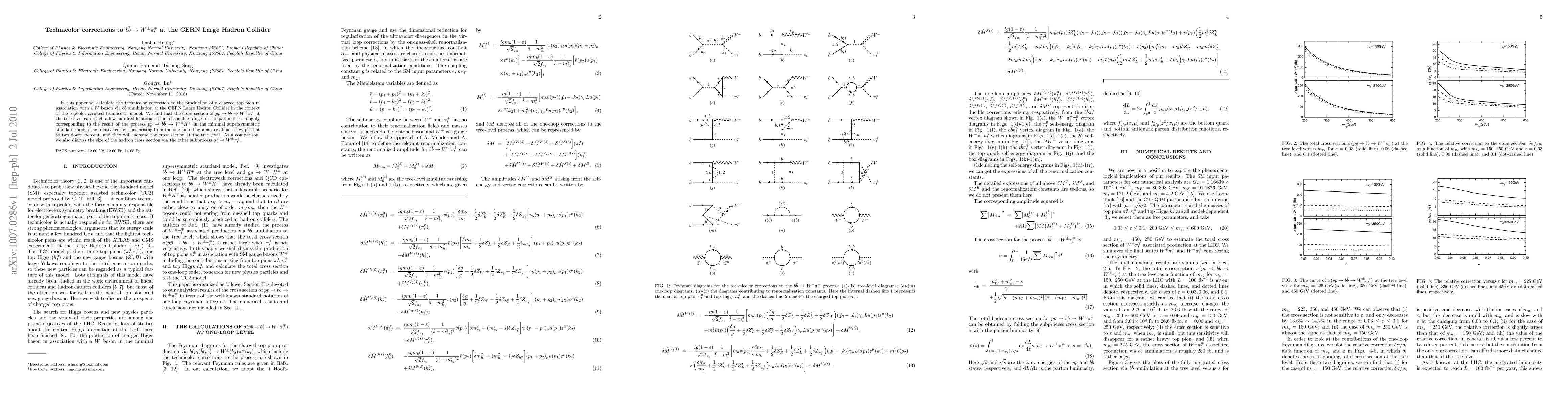This paper calculates the technicolor corrections to the production of a charged top pion with a W boson via b\bar{b} annihilation at the LHC, finding that tree-level cross sections can reach a few hundred femtobarns. The one-loop corrections are estimated to increase the cross section by a few percent to two dozen percent.