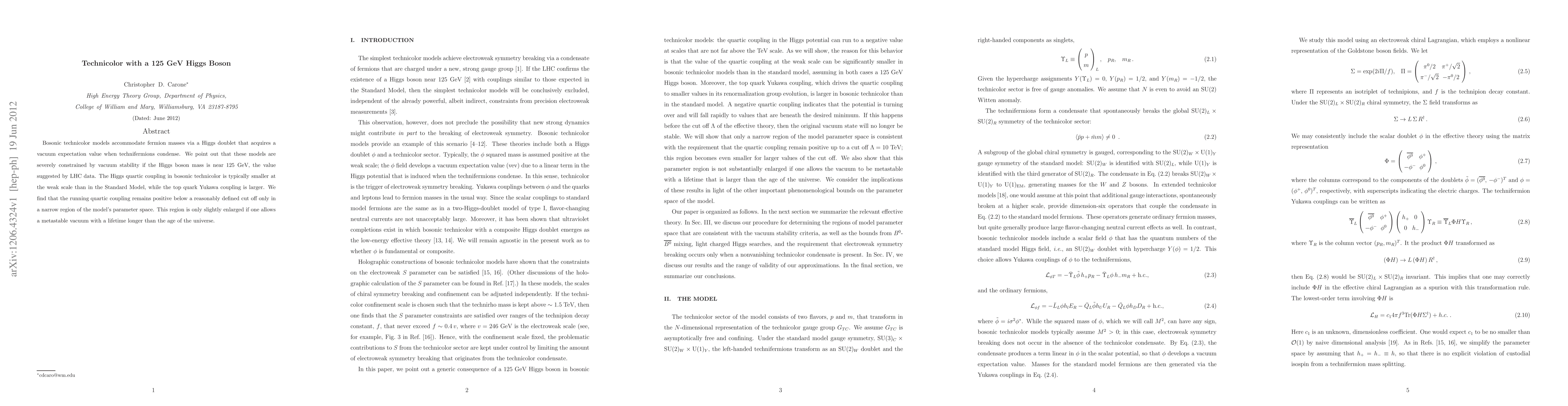 This paper examines bosonic technicolor models where fermion masses arise from a Higgs doublet, finding that models with a 125 GeV Higgs face stringent vacuum stability constraints. The study reveals that only a narrow parameter space allows for a positive running quartic coupling, with slight expansion possible for metastable vacua.
