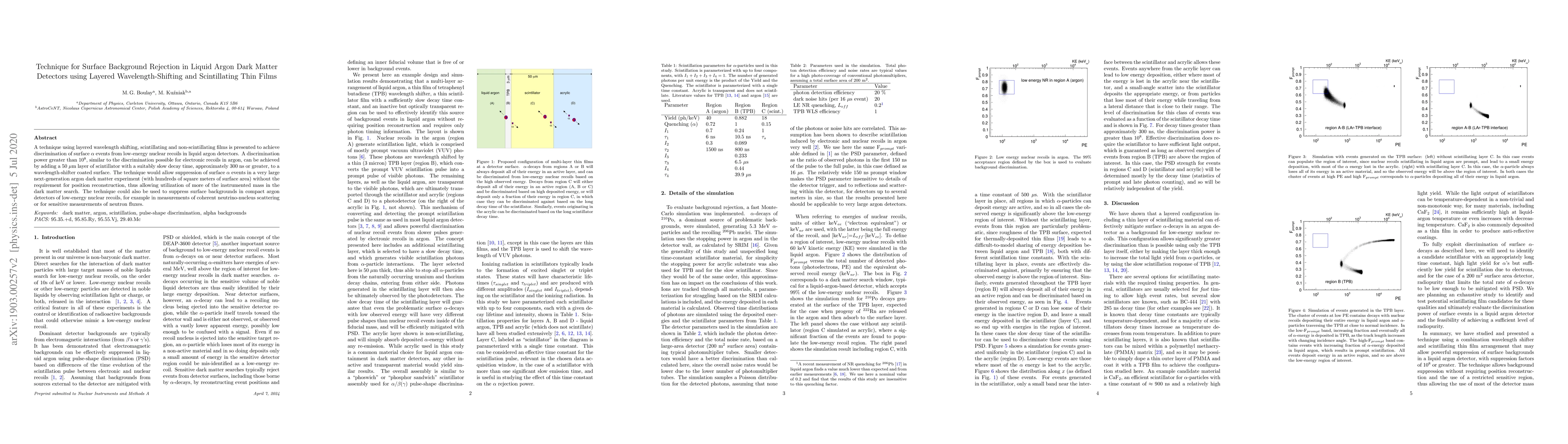 This paper introduces a method using layered wavelength-shifting and scintillating thin films to effectively discriminate surface $\alpha$ events from low-energy nuclear recoils in liquid argon detectors, achieving a discrimination power of over $10^{8}$. The technique involves adding a 50 micron layer of scintillator to a wavelength-shifter coated surface, enabling large-scale dark matter experiments to suppress surface backgrounds without requiring position reconstruction.