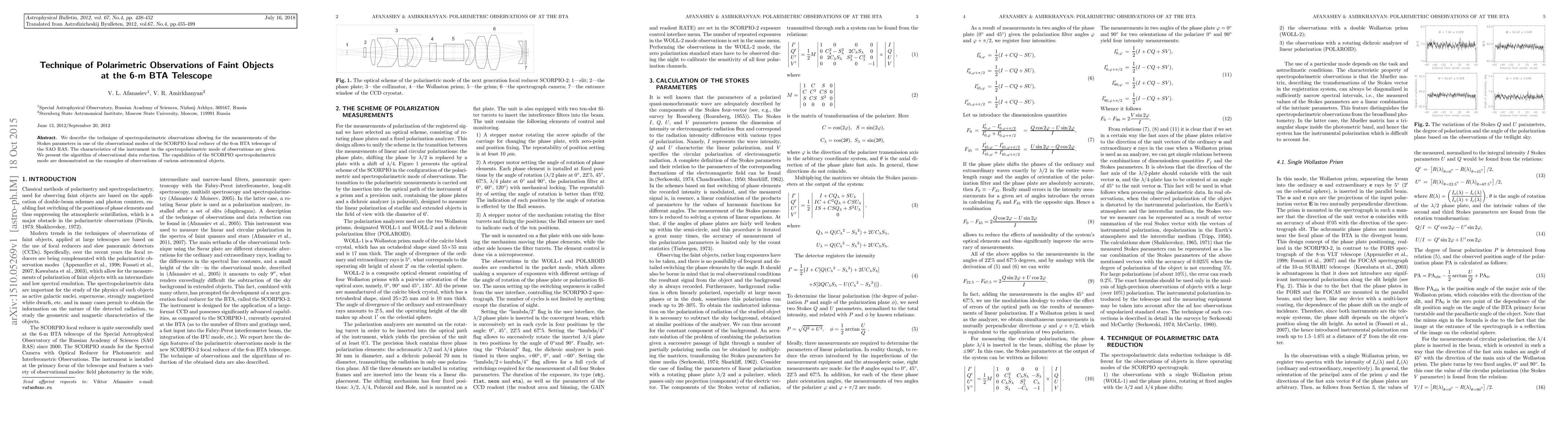 This paper outlines a spectropolarimetric technique for observing faint objects using the SCORPIO focal reduceer on the 6-m BTA telescope, detailing the measurement of Stokes parameters and presenting an algorithm for data reduction, exemplified through observations of various astronomical objects.