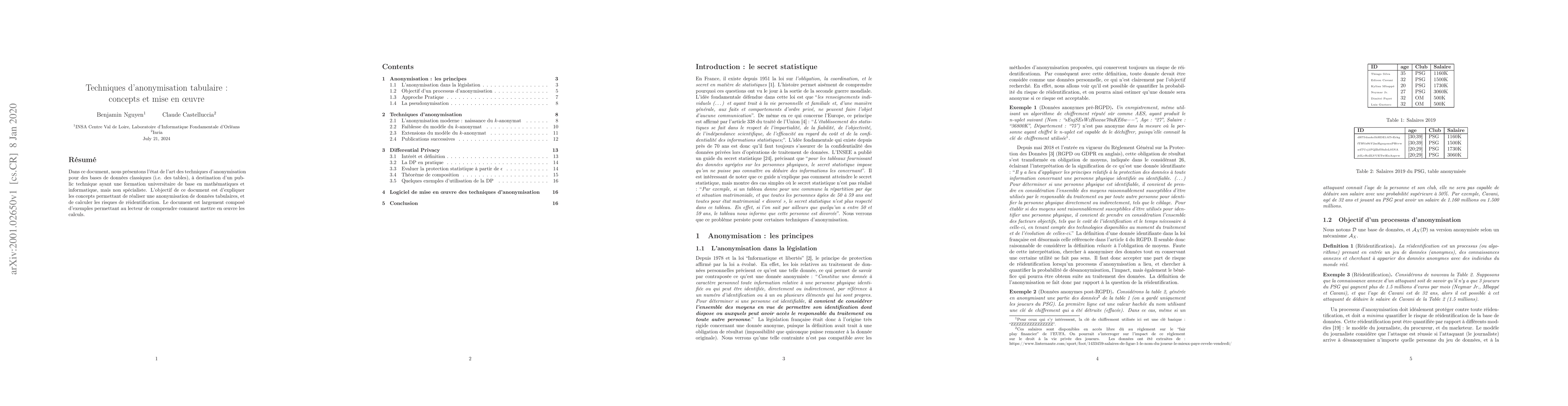 In this document, we present a state of the art of anonymization techniques for classical tabular datasets. This article is geared towards a general public having some knowledge of mathematics and computer science, but with no need for specific knowledge in anonymization. The objective of this document it to explain anonymization concepts in order to be able to sanitize a dataset and compute reindentification risk. The document contains a large number of examples to help understand the calculations. ----- Dans ce document, nous pr\'esentons l'\'etat de l'art des techniques d'anonymisation pour des bases de donn\'ees classiques (i.e. des tables), \`a destination d'un public technique ayant une formation universitaire de base en math\'ematiques et informatique, mais non sp\'ecialiste. L'objectif de ce document est d'expliquer les concepts permettant de r\'ealiser une anonymisation de donn\'ees tabulaires, et de calculer les risques de r\'eidentification. Le document est largement compos\'e d'exemples permettant au lecteur de comprendre comment mettre en oeuvre les calculs.