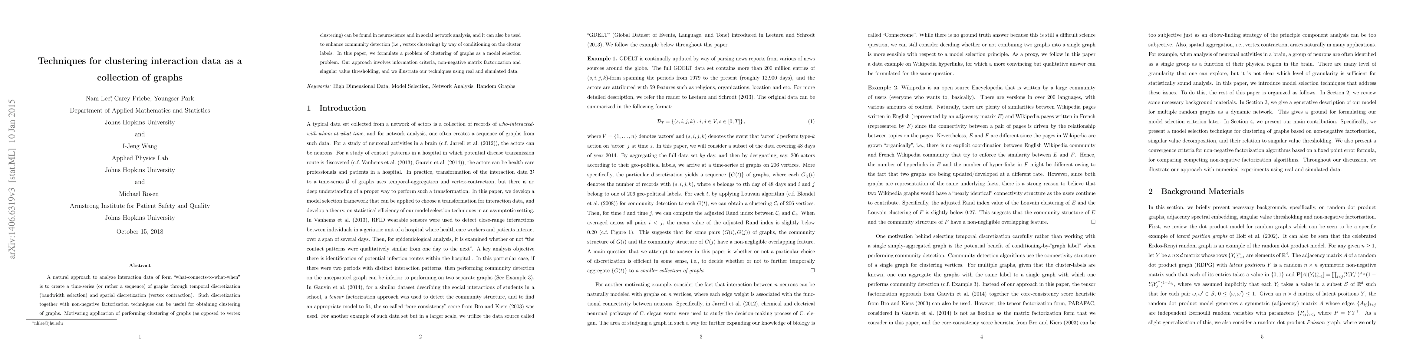 This paper proposes techniques for clustering interaction data represented as a sequence of graphs through temporal and spatial discretization. It formulates graph clustering as a model selection problem, employing non-negative matrix factorization and singular value thresholding, and demonstrates its effectiveness through real and simulated data.
