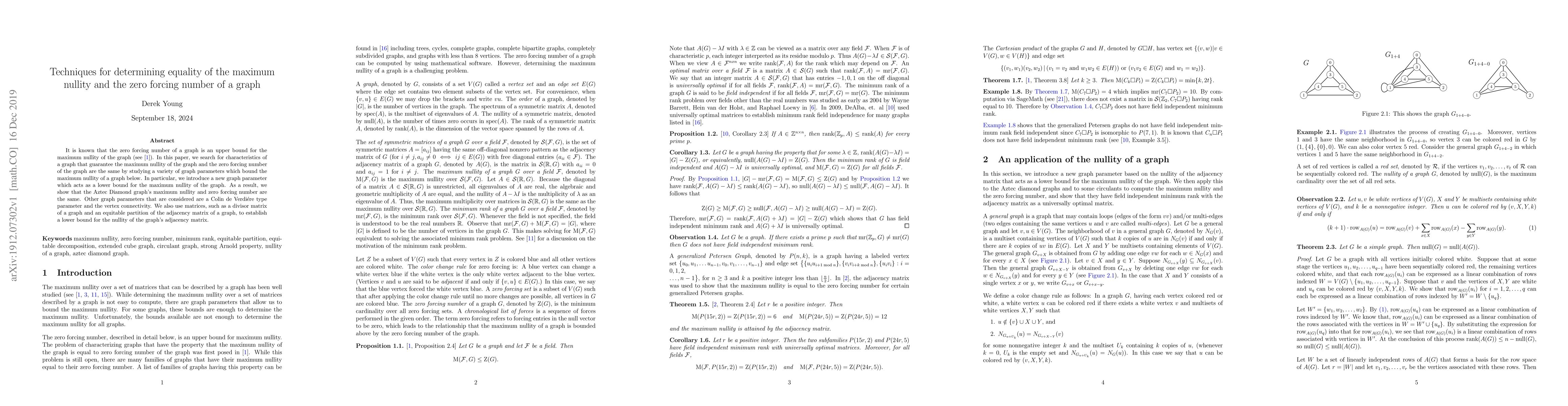 It is known that the zero forcing number of a graph is an upper bound for the maximum nullity of the graph. In this paper, we search for characteristics of a graph that guarantee the maximum nullity of the graph and the zero forcing number of the graph are the same by studying a variety of graph parameters which bound the maximum nullity of a graph below. In particular, we introduce a new graph parameter which acts as a lower bound for the maximum nullity of the graph. As a result, we show that the Aztec Diamond graph's maximum nullity and zero forcing number are the same. Other graph parameters that are considered are a Colin de Verdi\'ere type parameter and the vertex connectivity. We also use matrices, such as a divisor matrix of a graph and an equitable partition of the adjacency matrix of a graph, to establish a lower bound for the nullity of the graph's adjacency matrix.