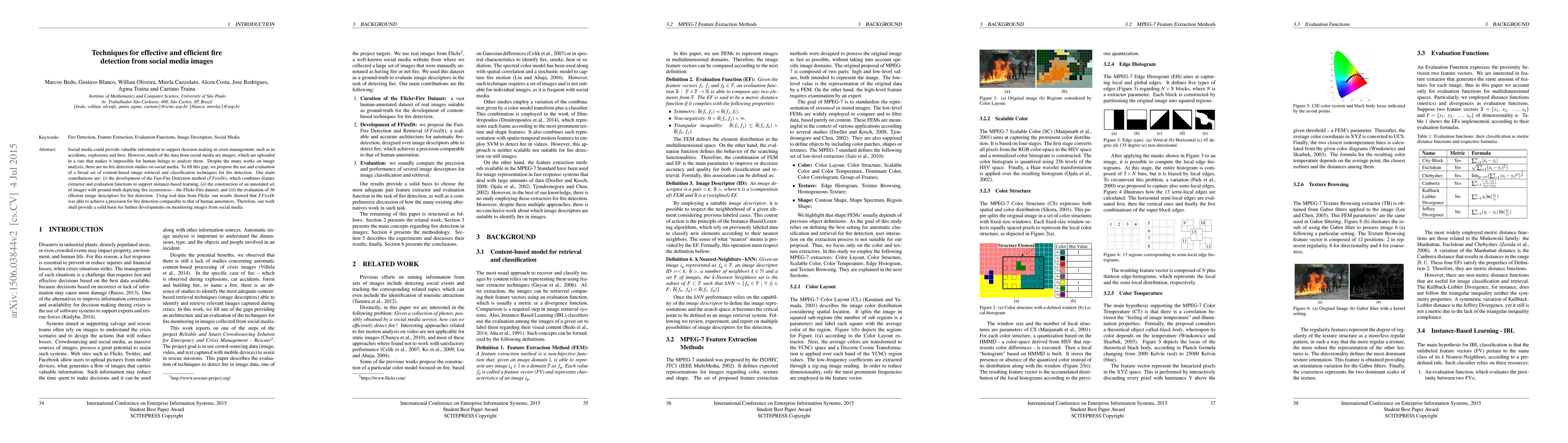 This paper introduces a novel method, Fast-Fire Detection (FFDnR), for efficient fire detection in social media images using content-based retrieval and classification techniques. It also presents the FlickrFire dataset, an annotated collection of fire images, and evaluates 36 image descriptors, showing FFDnR's precision matches that of human annotators.