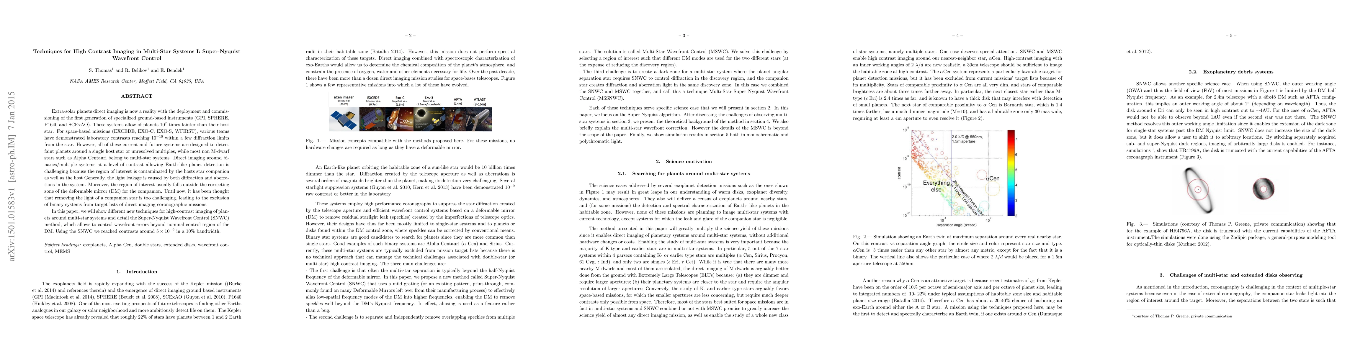 Extra-solar planets direct imaging is now a reality with the deployment and commissioning of the first generation of specialized ground-based instruments (GPI, SPHERE, P1640 and SCExAO). These systems allow of planets $ 10 ^ 7 $ times fainter than their host star. For space-based missions (EXCEDE, EXO-C, EXO-S, WFIRST), various teams have demonstrated laboratory contrasts reaching $ 10 ^ { -10 } $ within a few diffraction limits from the star. However, all of these current and future systems are designed to detect faint planets around a single host star or unresolved multiples, while most non M-dwarf stars such as Alpha Centauri belong to multi-star systems. Direct imaging around binaries/multiple systems at a level of contrast allowing Earth-like planet detection is challenging because the region of interest is contaminated by the hosts star companion as well as the host Generally, the light leakage is caused by both diffraction and aberrations in the system. Moreover, the region of interest usually falls outside the correcting zone of the deformable mirror (DM) for the companion. Until now, it has been thought that removing the light of a companion star is too challenging, leading to the exclusion of binary systems from target lists of direct imaging coronographic missions. In this paper, we will show different new techniques for high-contrast imaging of planets around multi-star systems and detail the Super-Nyquist Wavefront Control (SNWC) method, which allows to control wavefront errors beyond nominal control region of the DM. Using the SNWC we reached contrasts around $ 5 \times 10 ^ { -9 } $ in a 10% bandwidth.