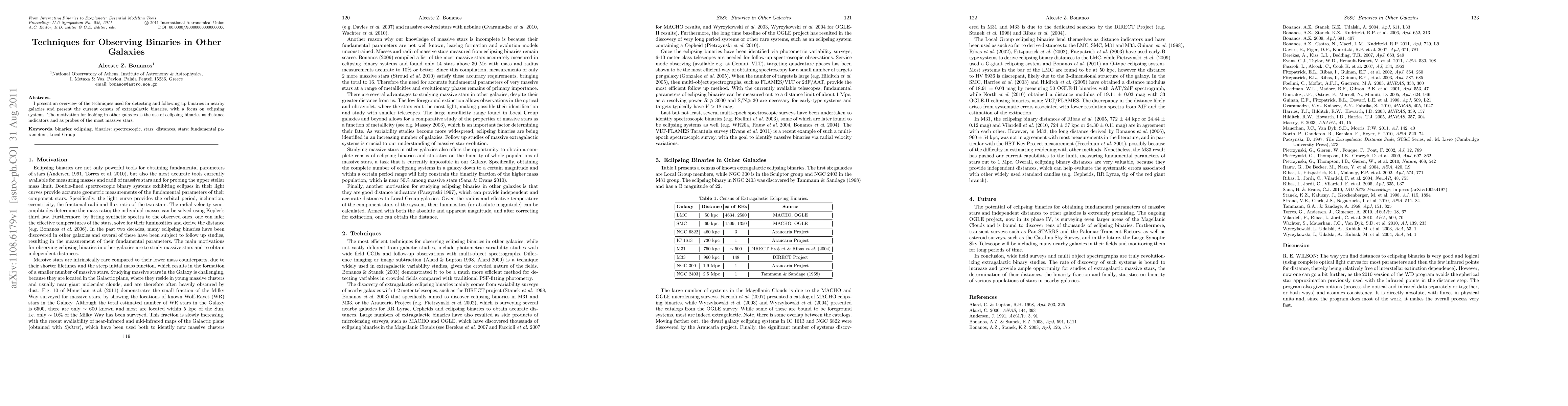 I present an overview of the techniques used for detecting and following up binaries in nearby galaxies and present the current census of extragalactic binaries, with a focus on eclipsing systems. The motivation for looking in other galaxies is the use of eclipsing binaries as distance indicators and as probes of the most massive stars.