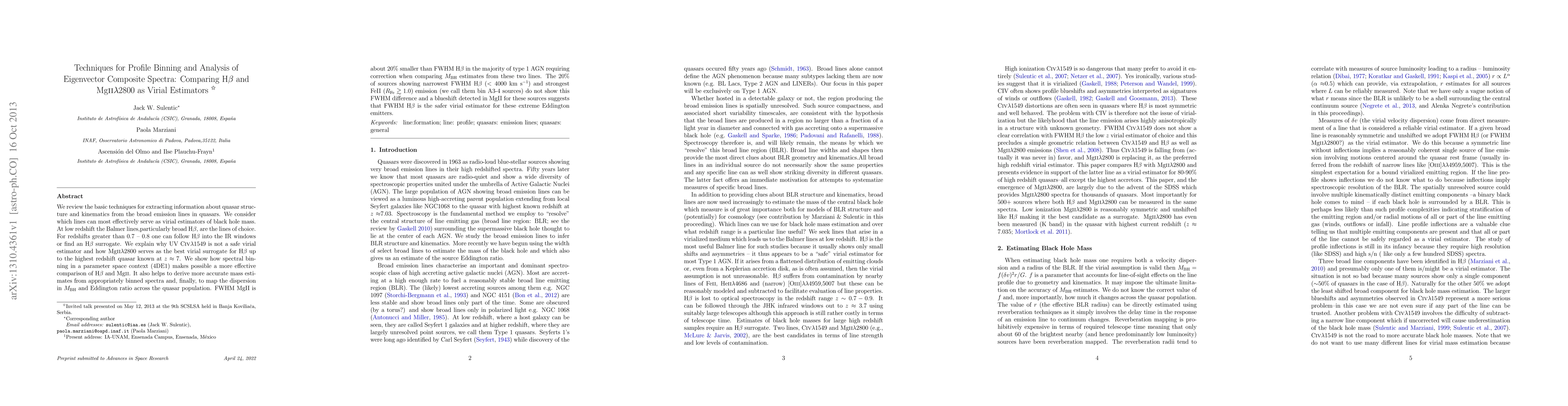 We review the basic techniques for extracting information about quasar structure and kinematics from the broad emission lines in quasars. We consider which lines can most effectively serve as virial estimators of black hole mass. At low redshift the Balmer lines,particularly broad H beta, are the lines of choice. For redshifts greater than 0.7 - 0.8 one can follow H beta into the IR windows or find an H beta surrogate. We explain why UV CIV 1549 is not a safe virial estimator and how MgII 2800 serves as the best virial surrogate for H beta up to the highest redshift quasar known at z ~ 7. We show how spectral binning in a parameter space context (4DE1) makes possible a more effective comparison of H beta and MgII. It also helps to derive more accurate mass estimates from appropriately binned spectra and, finally, to map the dispersion in black hole mass and Eddington ratio across the quasar population. FWHM MgII is about 20% smaller than FWHM H beta in the majority of type 1 AGN requiring correction when comparing black hole mass estimates from these two lines. The 20% of sources showing narrowest FWHM H beta (< 4000 km/s) and strongest FeII (R_FeII >~ 1.0) emission (we call them bin A3-4 sources) do not show this FWHM difference and a blueshift detected in MgII for these sources suggests that FWHM H beta is the safer virial estimator for these extreme Eddington emitters.