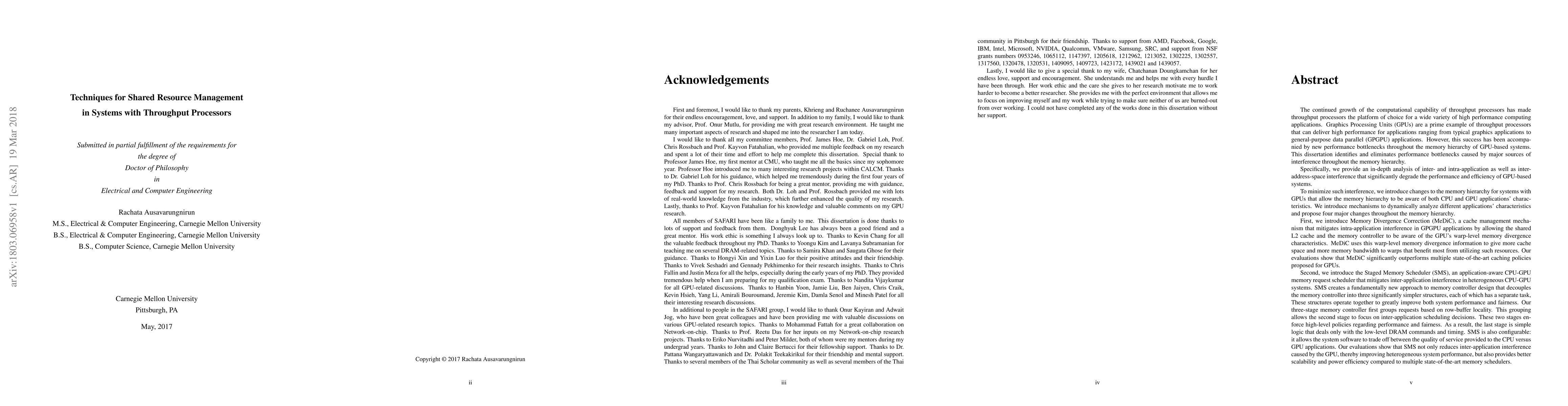 This paper proposes techniques to manage shared resources in systems with throughput processors like GPUs, focusing on mitigating performance bottlenecks caused by interference in the memory hierarchy. It introduces changes to cache management, memory scheduling, and memory controller design to reduce both intra-application and inter-application interference, ultimately enhancing GPU-based system performance.