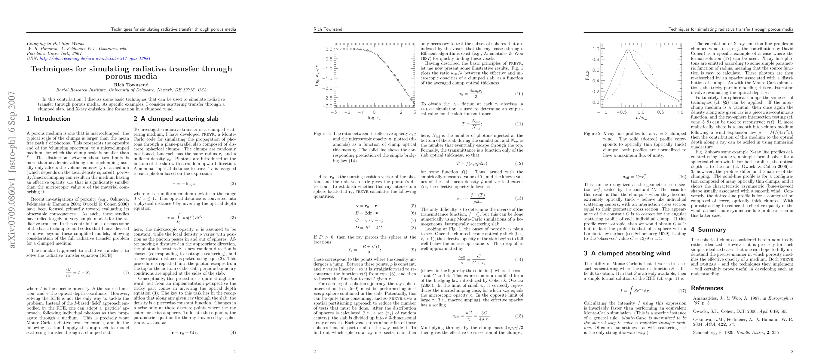 Summary: This paper explores fundamental methods for simulating radiative transfer in porous media, focusing on scattering transfer in clumped slabs and X-ray emission line formation in clumped winds. The techniques discussed provide insights into the behavior of radiation within such complex structures.