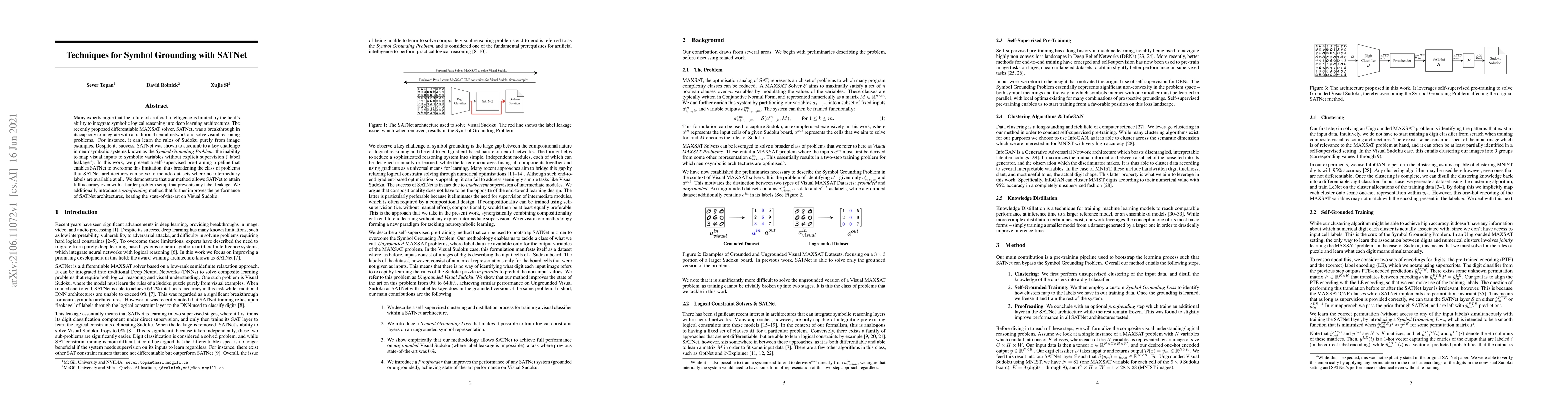 Many experts argue that the future of artificial intelligence is limited by the field's ability to integrate symbolic logical reasoning into deep learning architectures. The recently proposed differentiable MAXSAT solver, SATNet, was a breakthrough in its capacity to integrate with a traditional neural network and solve visual reasoning problems. For instance, it can learn the rules of Sudoku purely from image examples. Despite its success, SATNet was shown to succumb to a key challenge in neurosymbolic systems known as the Symbol Grounding Problem: the inability to map visual inputs to symbolic variables without explicit supervision ("label leakage"). In this work, we present a self-supervised pre-training pipeline that enables SATNet to overcome this limitation, thus broadening the class of problems that SATNet architectures can solve to include datasets where no intermediary labels are available at all. We demonstrate that our method allows SATNet to attain full accuracy even with a harder problem setup that prevents any label leakage. We additionally introduce a proofreading method that further improves the performance of SATNet architectures, beating the state-of-the-art on Visual Sudoku.