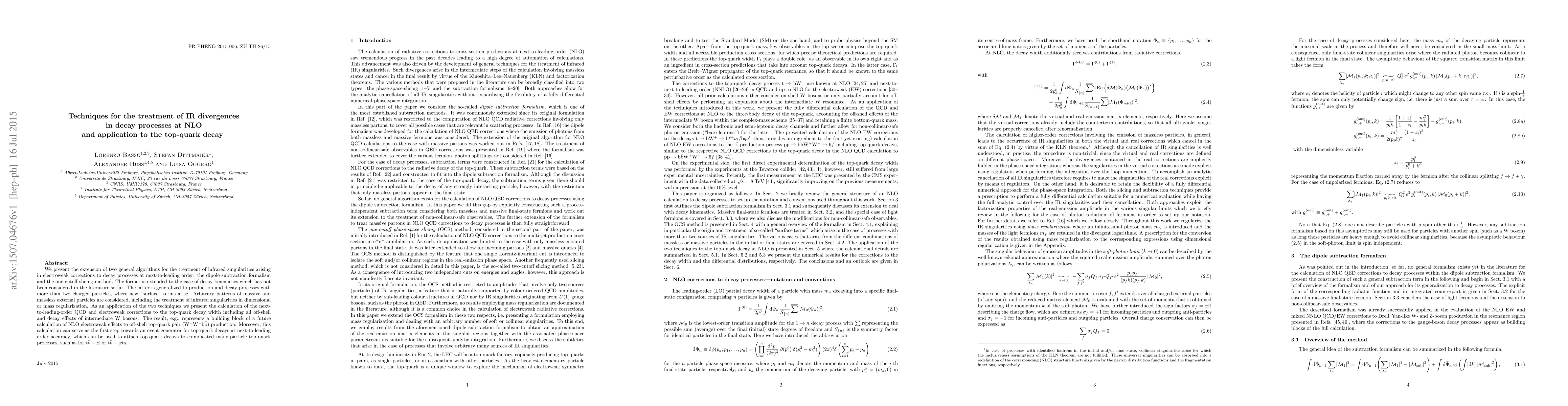This paper extends two algorithms for handling infrared divergences in next-to-leading order decay processes, applying them to calculate the top-quark decay width with QCD and electroweak corrections, including intermediate W bosons. The techniques can also serve as a foundation for future calculations of off-shell top-quark pair production and event generators for top-quark decays.