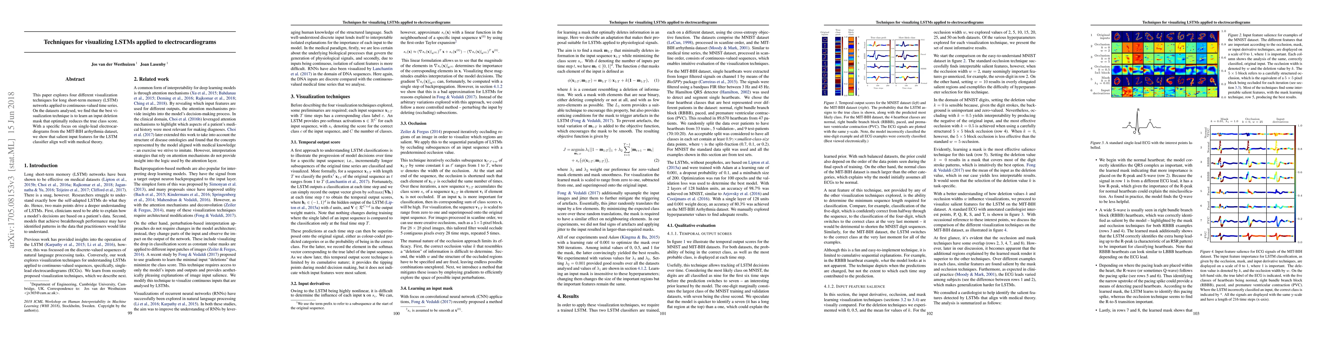 This paper explores four different visualization techniques for long short-term memory (LSTM) networks applied to continuous-valued time series. On the datasets analysed, we find that the best visualization technique is to learn an input deletion mask that optimally reduces the true class score. With a specific focus on single-lead electrocardiograms from the MIT-BIH arrhythmia dataset, we show that salient input features for the LSTM classifier align well with medical theory.