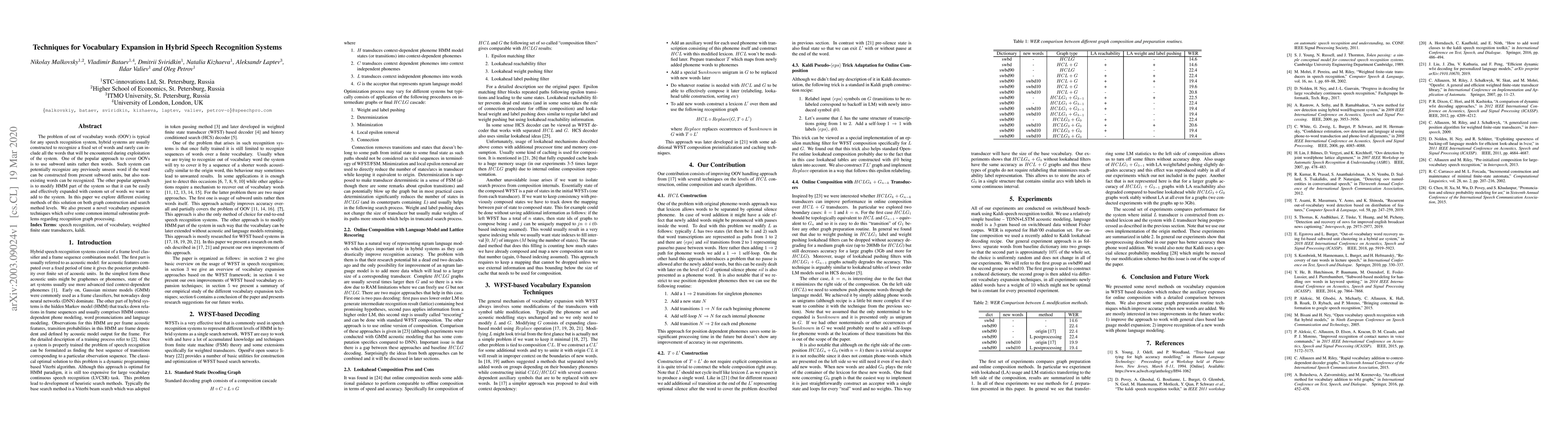 This paper explores techniques for expanding vocabulary in hybrid speech recognition systems to handle out-of-vocabulary (OOV) words. It examines existing methods on graph construction and search levels, and introduces novel vocabulary expansion techniques addressing common processing problems within recognition graphs.