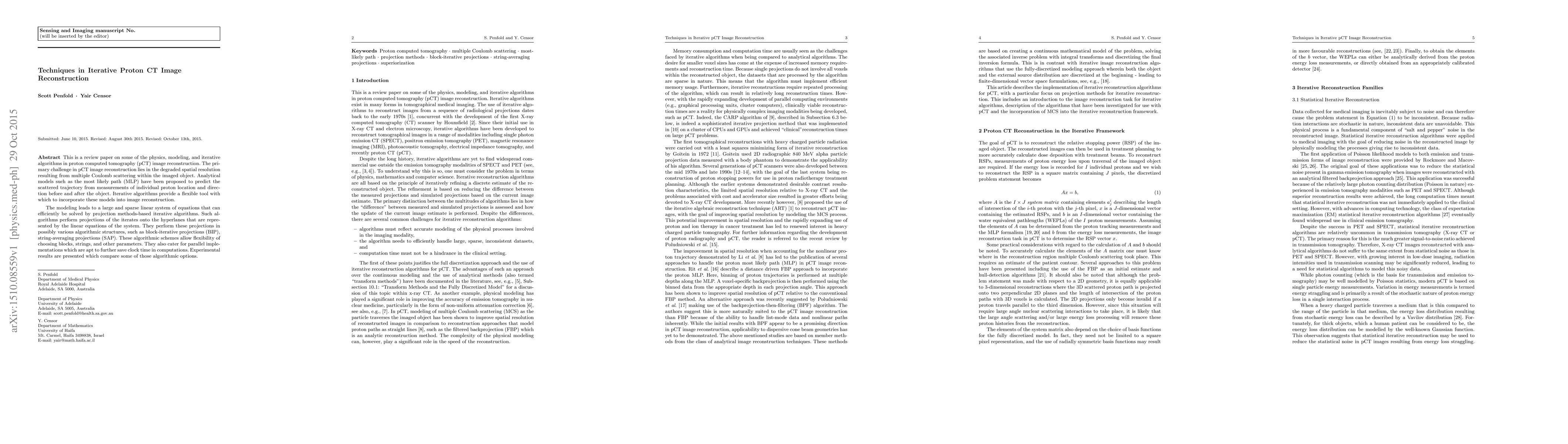 This paper reviews physics, modeling, and iterative algorithms for proton computed tomography (pCT) image reconstruction, focusing on overcoming spatial resolution degradation due to multiple Coulomb scattering. It discusses analytical models and iterative methods, including block-iterative and string-averaging projections, to solve large linear systems efficiently, with a comparison of experimental results.